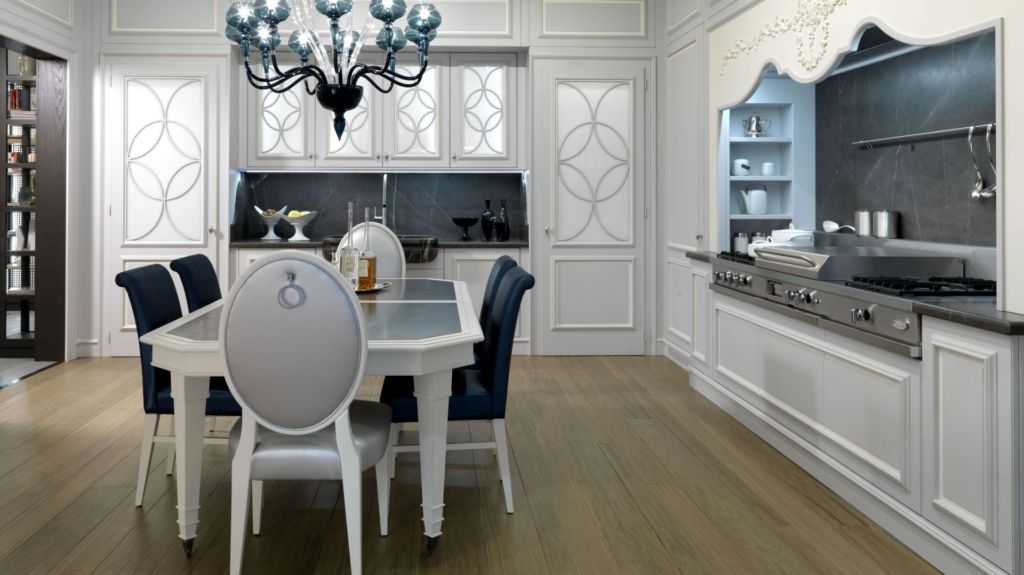 Кухня имеет квадратную форму и располагает больше к вечеринкам и приятному времяпровождению за семейными ужинами, чем к кулинарным экспериментам. Здесь вместо обеденного стола эффектная барная стойка с благородным подстольем.