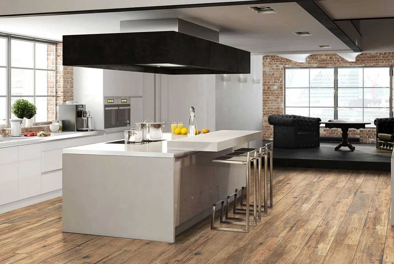 Некоторые дизайнеры не одобряют использование одного и того же материала на полу во всех комнатах, поэтому если кухня совмещена с гостиной, стоит рассмотреть возможность облицовки поверхности разным материалом в этом пространстве, особенно если вы хотите, чтобы кухня и гостиная образовывали интересный тандем. Это очень распространенное решение, позволяющее создать модное и стильное жилое пространство.