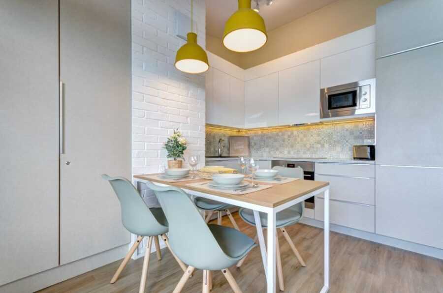Оптимально такая комбинация выглядит в студиях, а также совмещенных комнатах, которые выполняют одновременно несколько функций – кухня+гостиная либо кухня+столовая.