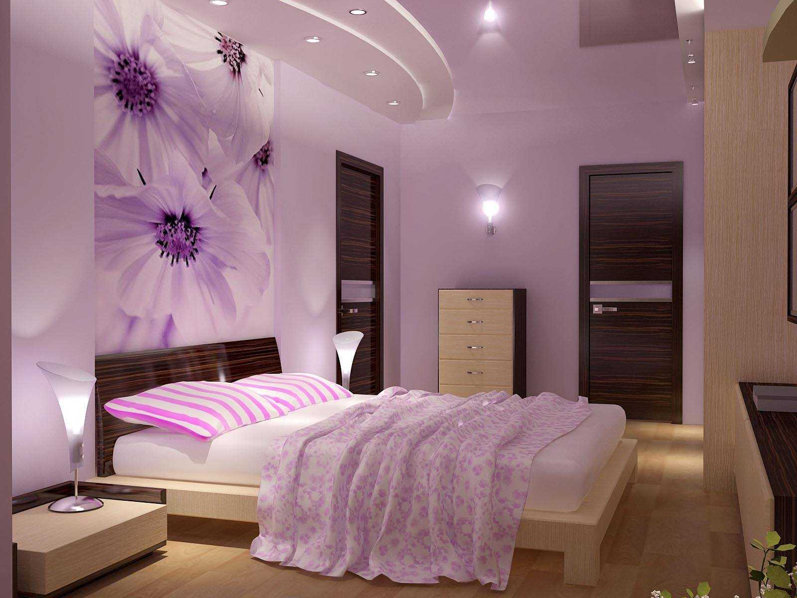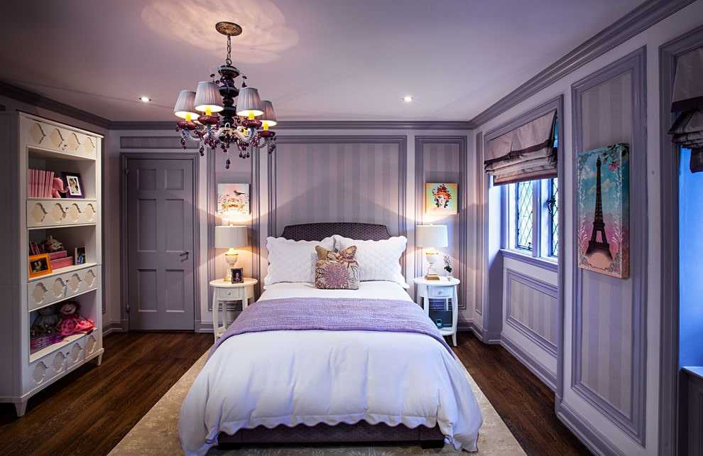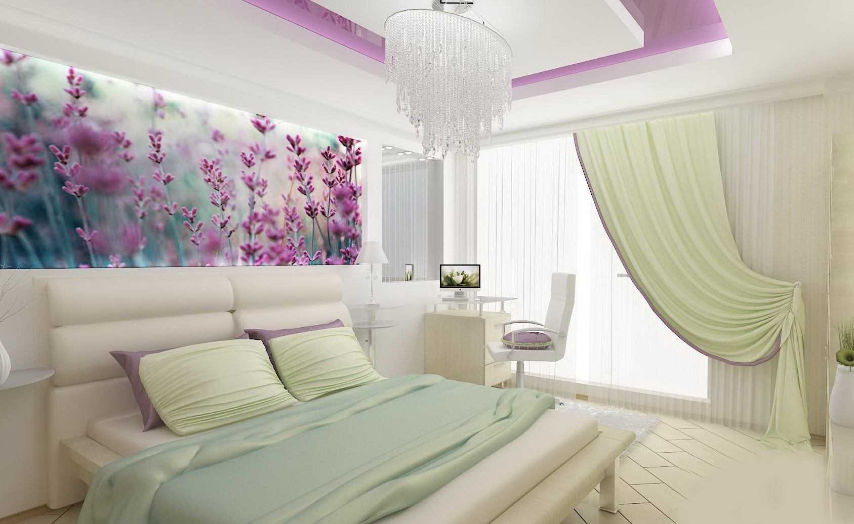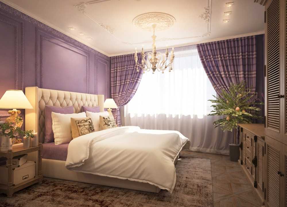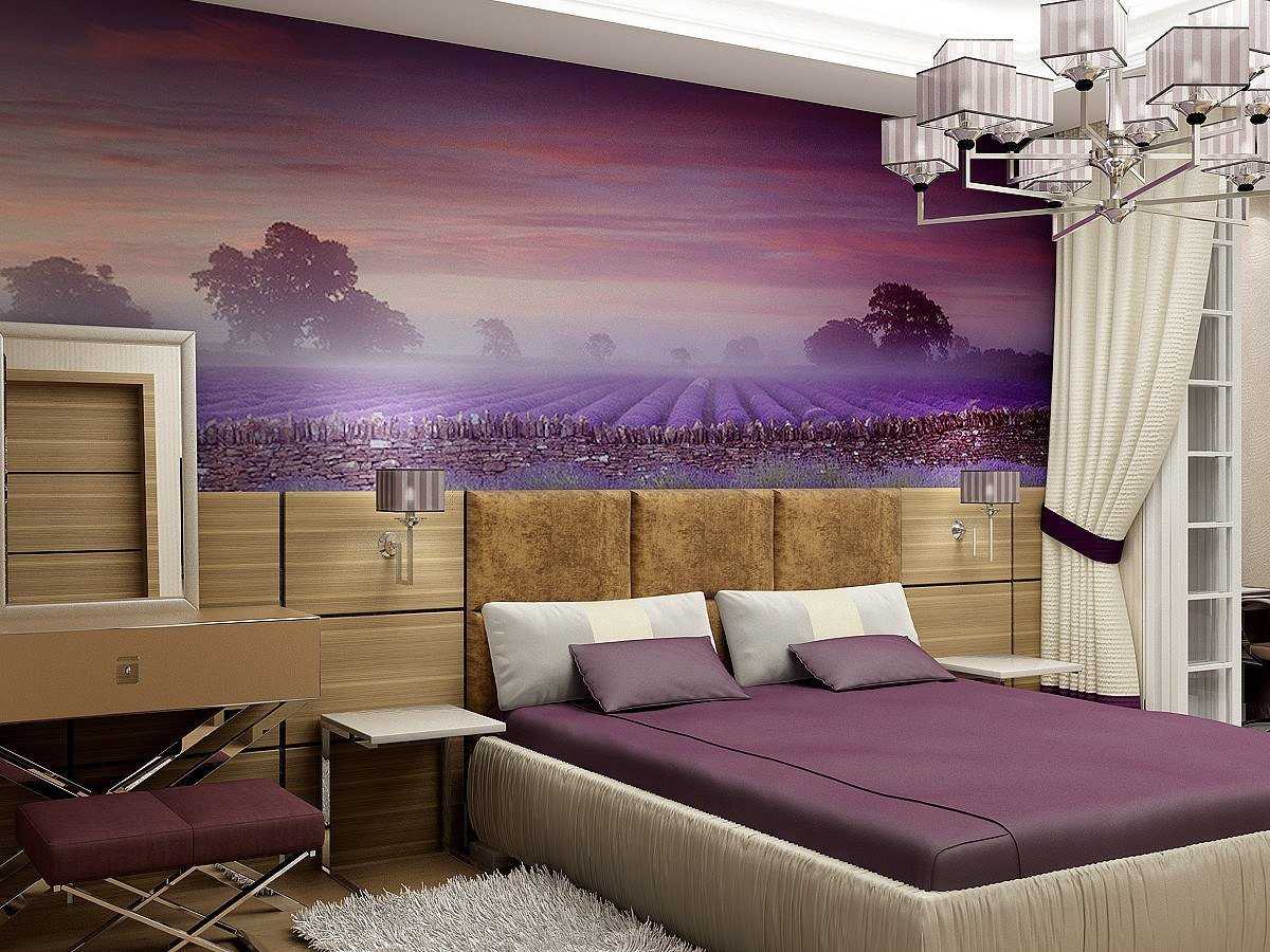В интерьере спальни атмосфера романтического Прованса может представлять собой настенную роспись с мотивом лавандовых полей. Цветовая гамма интерьера — пастельно-сиреневая с теплым белым. Такое оформление привнесет романтичный, деликатный характер женскому пространству.