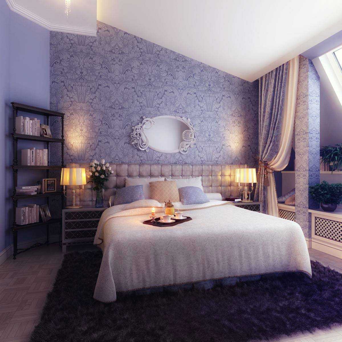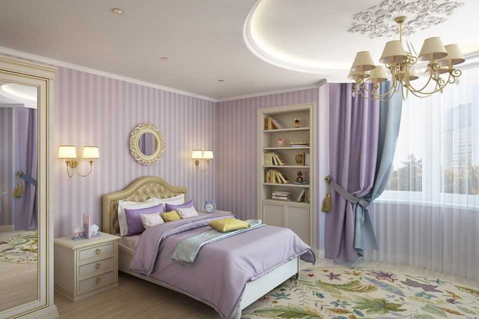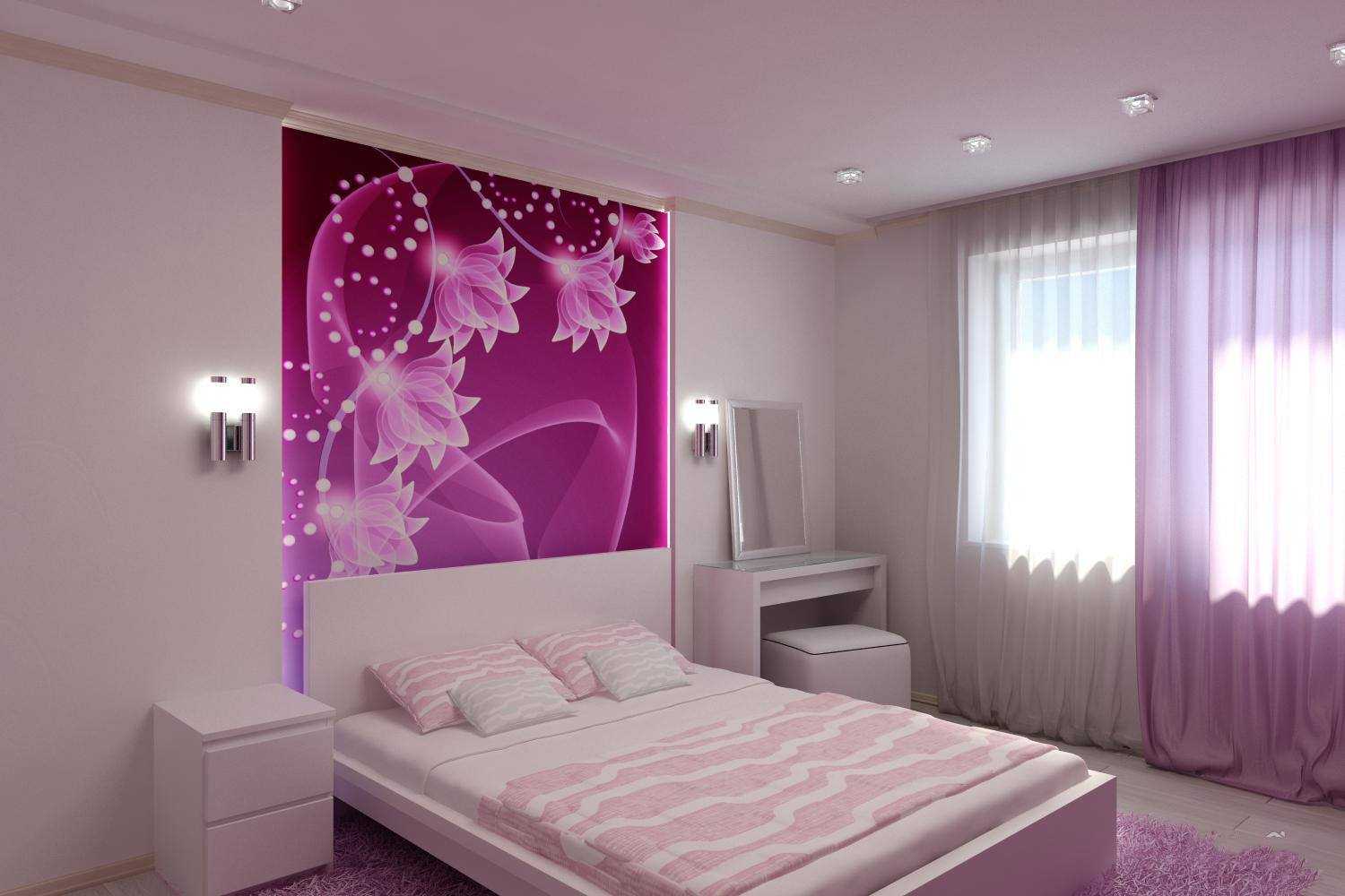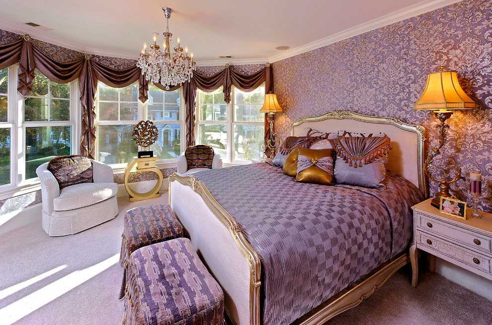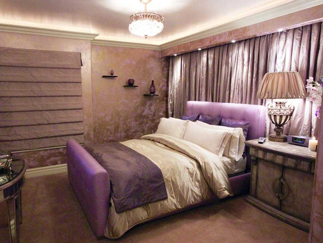 В интерьере спальни атмосфера романтического Прованса может представлять собой настенную роспись с мотивом лавандовых полей. Цветовая гамма интерьера — пастельно-сиреневая с теплым белым. Такое оформление привнесет романтичный, деликатный характер женскому пространству.