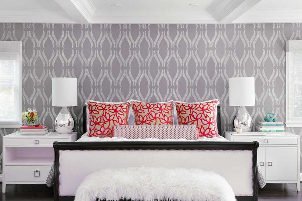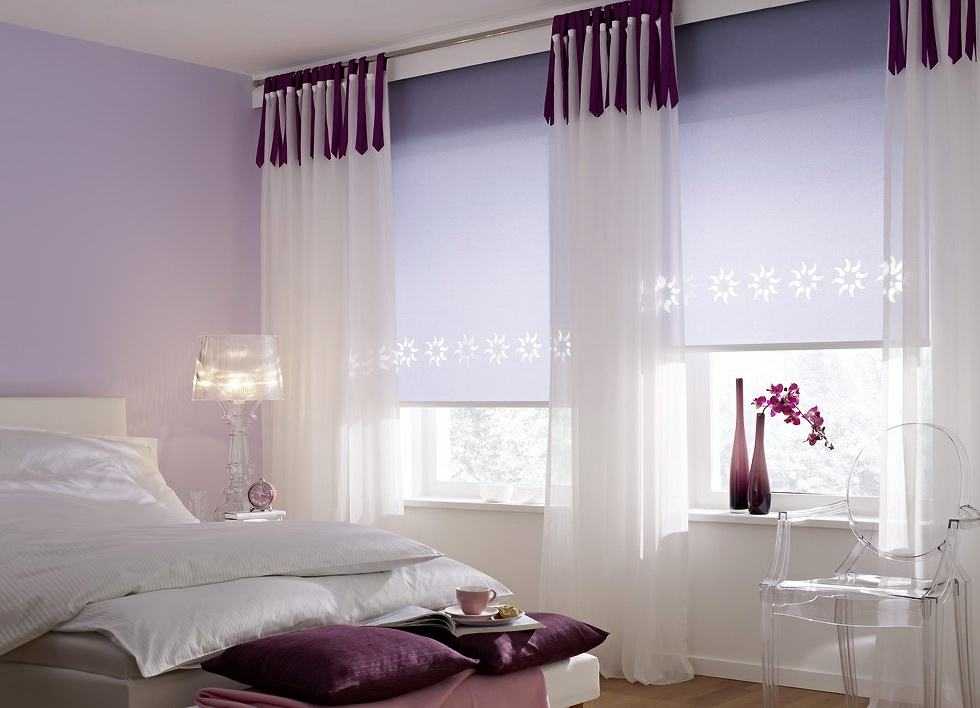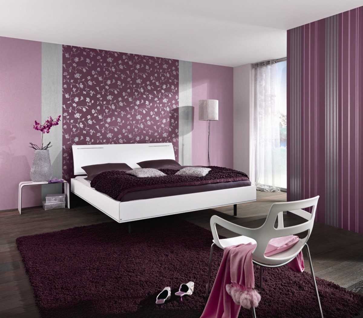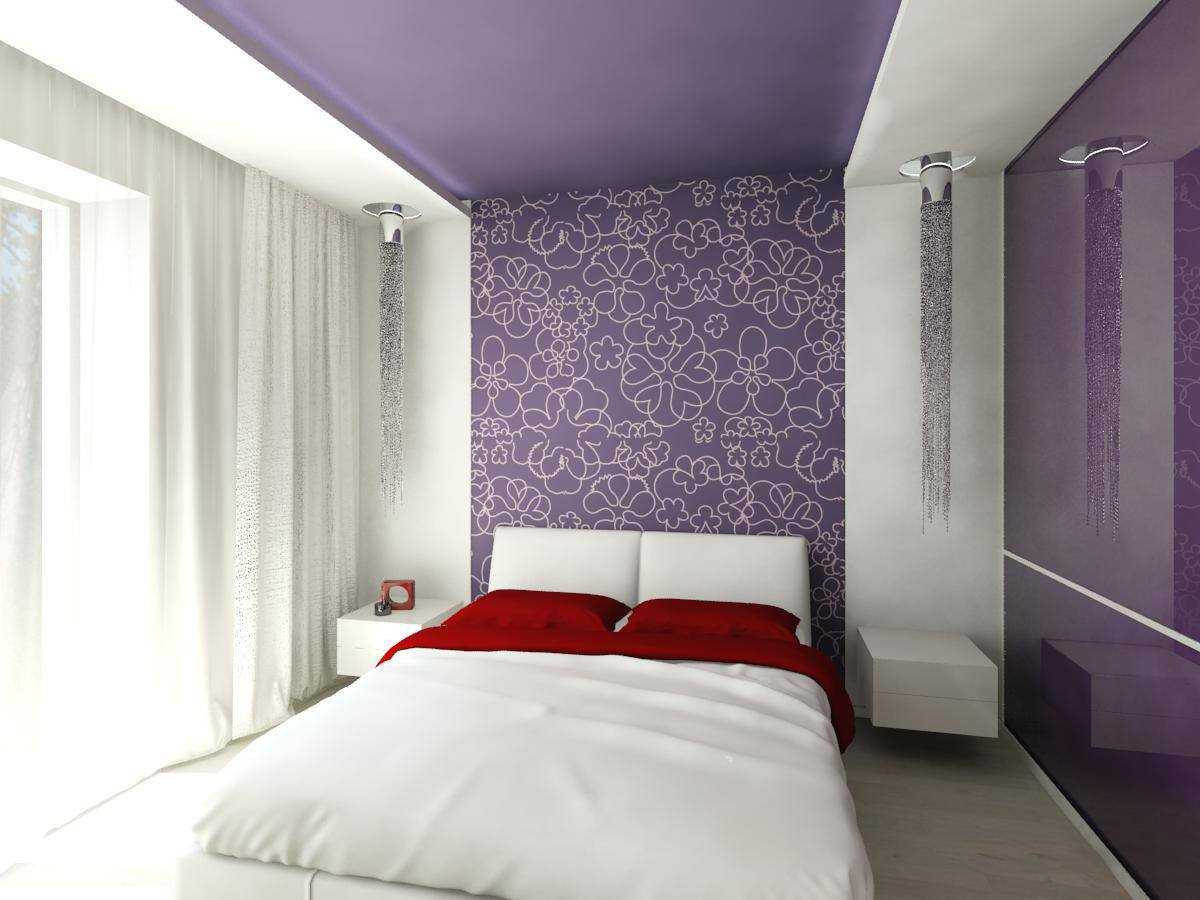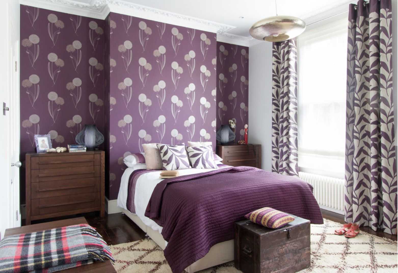 В современной романтичной спальне отлично смотрится сливово-сиреневый оттенок в качестве постельного белья и стеганого изголовья. Этот цвет в таком расположении дает ощущение утонченности и элегантности. Можно добавить темные жалюзи на окна и стену с узорчатыми обоями. Это идеальный фон для белой кожаной кровати. Белый, бордовый и сиреневый создают элегантную атмосферу в спальне.
