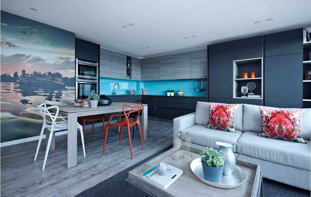 Освежающий, расслабляющий, воздушный голубой – не самый популярный вариант для кухонных помещений, но от того он не становится менее оригинальным. Более того, голубая кухня с ограниченной площадью кажется визуально больше. Главное, правильно сочетать и дозировать этот цвет. Оптимальные комбинации следующие: