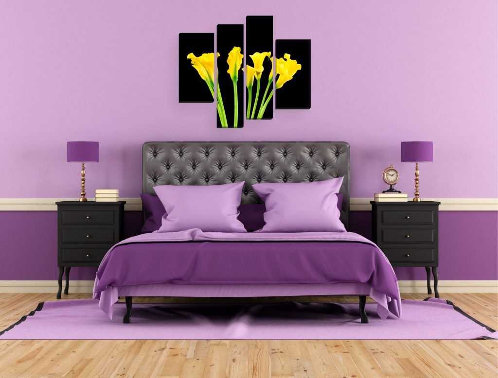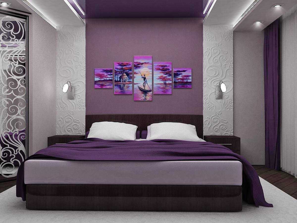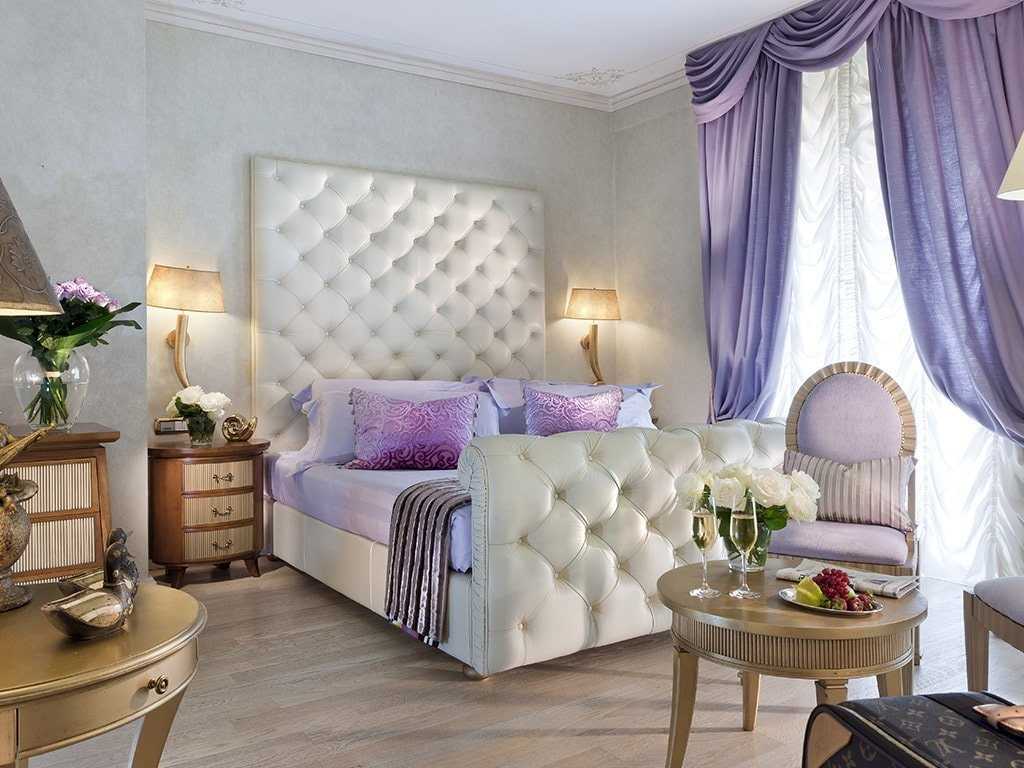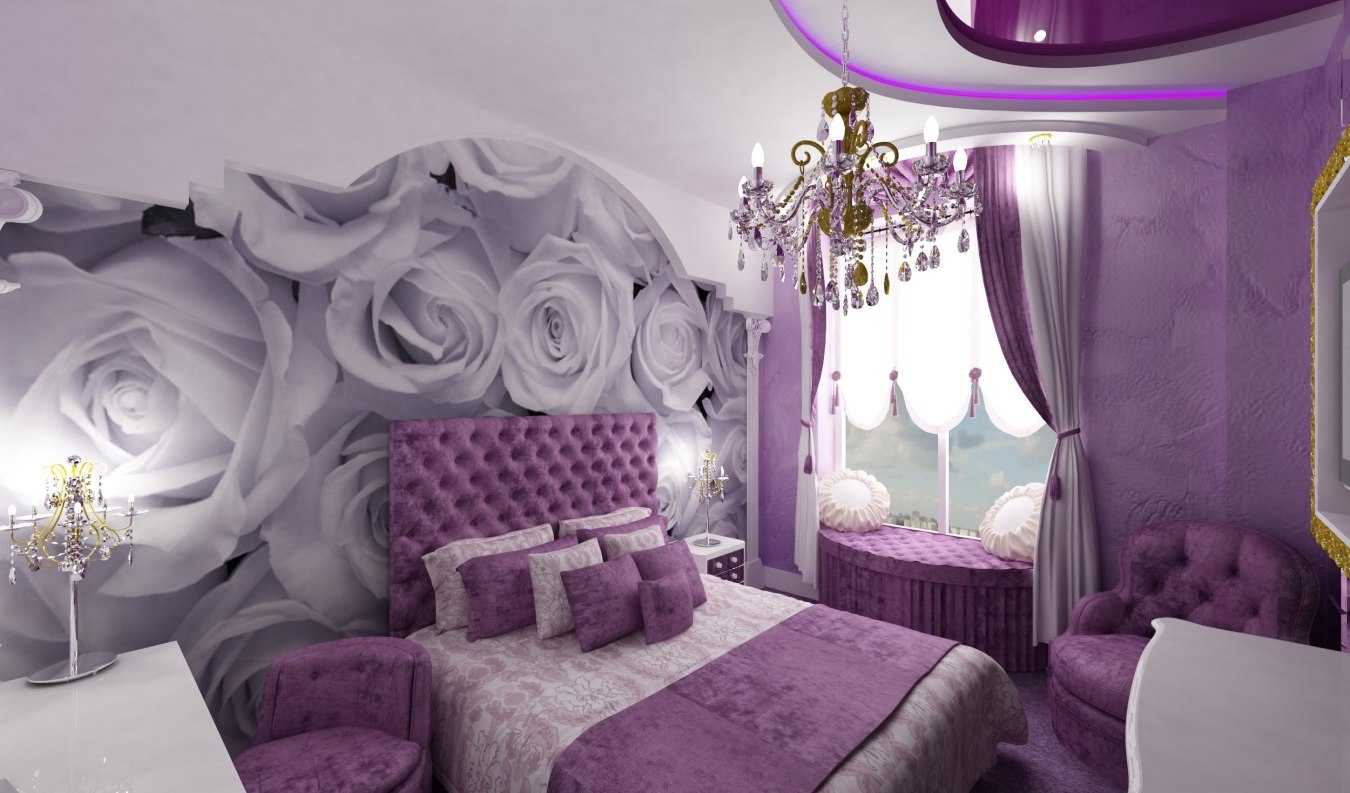 Узкая комната, оформленная в современном глэм-стиле с использованием сиреневого, смотрится потрясающе. Романтическая спальня, в которой доминирует французский стиль, — это еще один образ яркого сиреневого в интерьере. Сильнейшим акцентом интерьера станет стена над изголовьем с красивыми фото-обоями. Это эффектный фон для яркой кровати со стеганым изголовьем. Авангардный сиреневый цвет может быть повторен в дополнениях: постельные принадлежности и подушки.