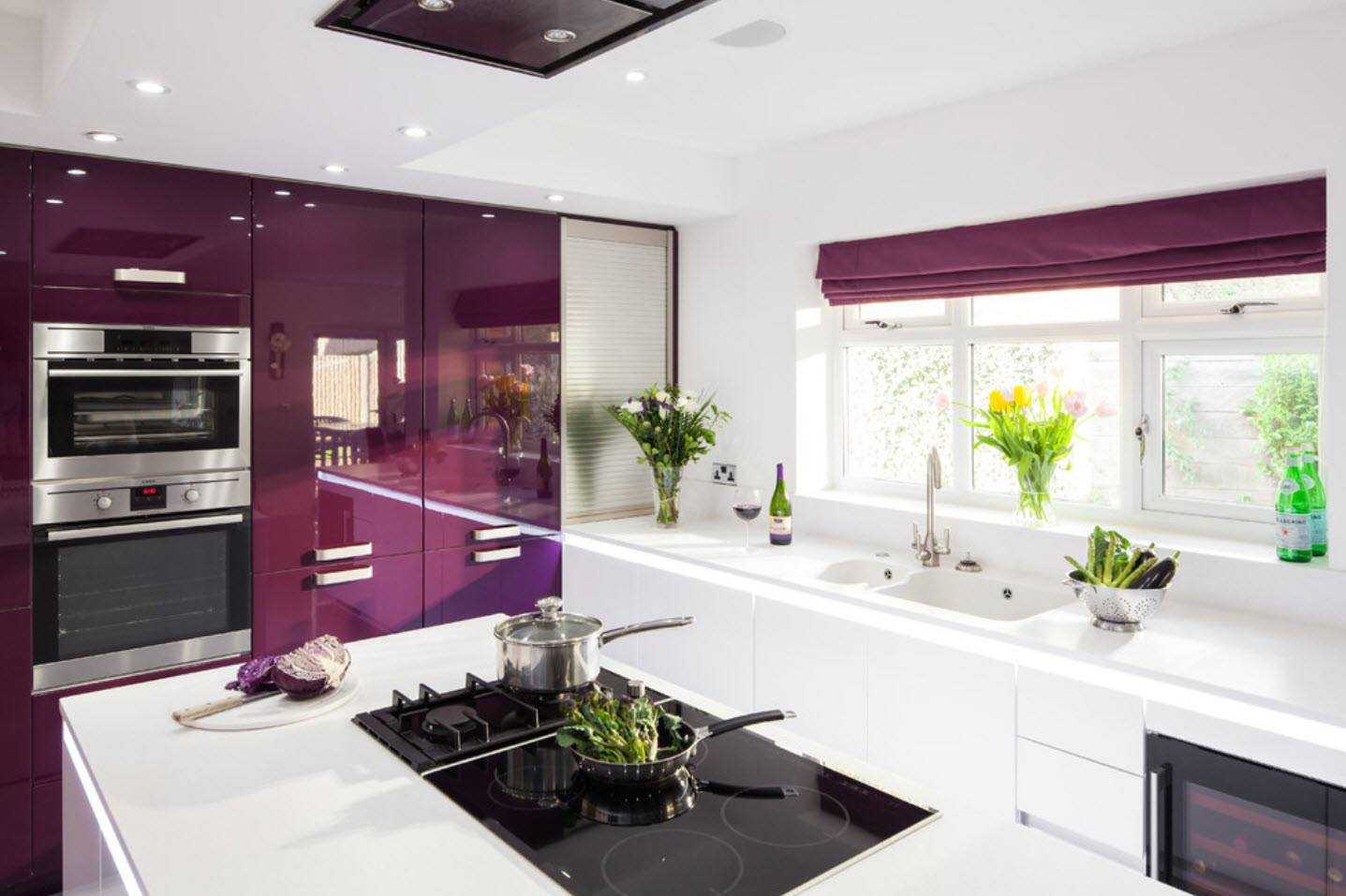 Конечно, первый стиль, который приходит в голову при упоминании фиолетовой кухни — современный. Более того, сразу прорисовываются насыщенного цвета глянцевые фасады. Но фасады могут и матовыми, и комбинированными. Основные принципы современного интерьера: