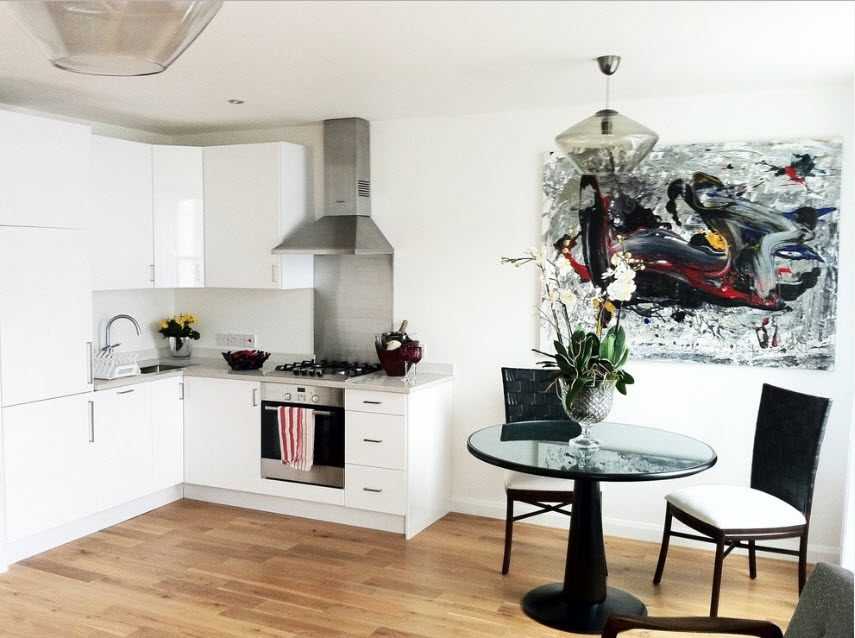 Кухонные интерьеры бывают хроматическими, обладающие цветовым тоном, или ахроматическими – белыми, серыми, черными. Полностью ахроматические интерьеры практические не встречаются, поскольку такая обстановка считается неблагоприятной для эмоционального состояния человека – может вызвать депрессию, апатию и цветовой голод. Но это несложно исправить, разбавив фон динамичным рисунком, к примеру, путем укладки черно-белой плитки на полу в шахматном порядке. Еще один вариант – освежить ахроматичность контрастным выразительным акцентом.
