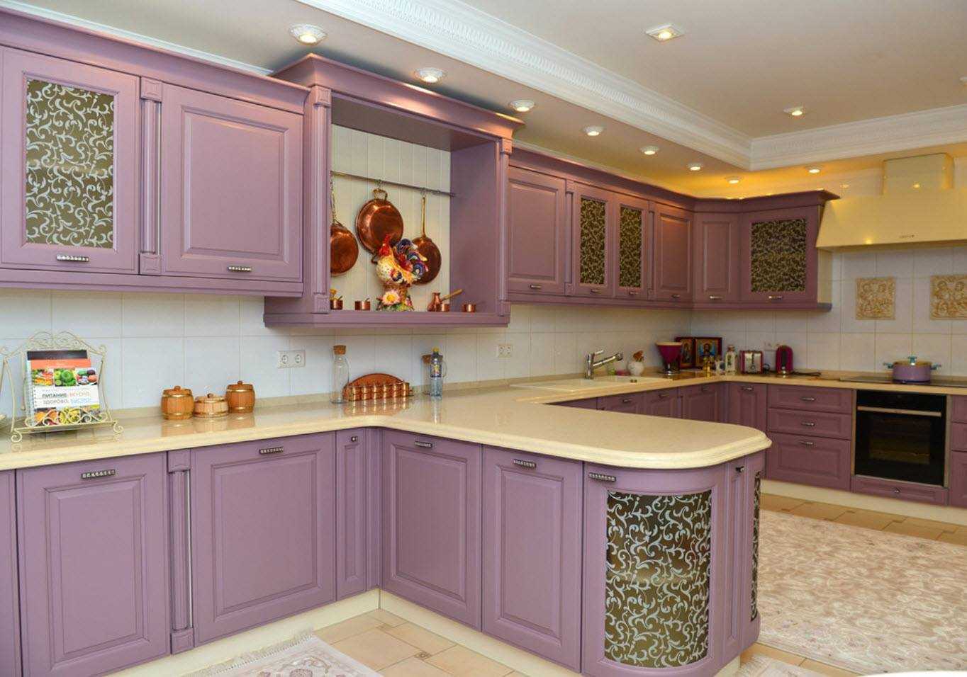 Стиль французской деревни. Для него характерны только пастельные тона, поэтому гарнитур выполняется в цвете светлой лаванды или фиалки. Обязательно присутствие вытяжки, столешницы из камня или массива дерева.
