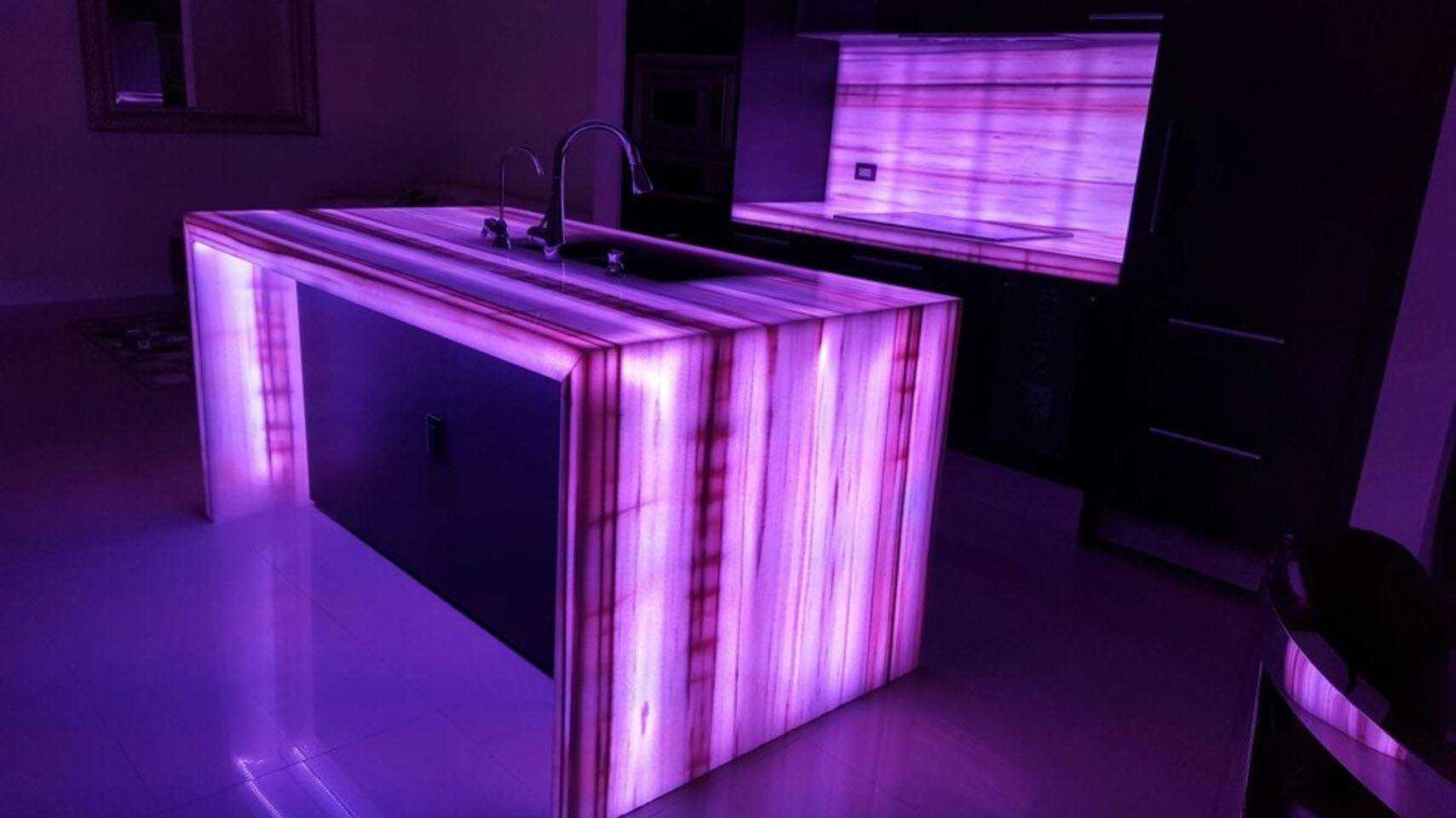 Стоит обратить внимание на сиреневый цвет «хамелеон» на столешнице острова. Интересное и свежее решение: сделать кирпичную кладку в светло-лавандовом тоне