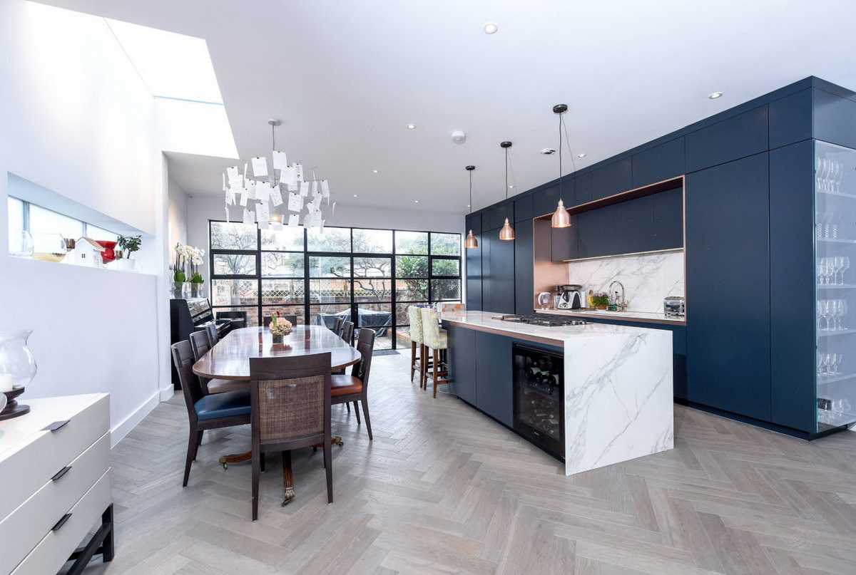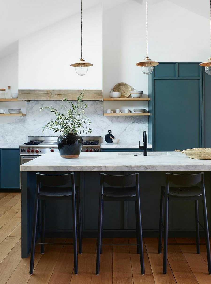 В 2021 году, если вы хотите добавить яркости пространству, наиболее часто используемыми цветами являются темно-синий, чернослив и лесной зеленый. Вы можете сделать это, применив его только к одному или нескольким элементам в вашей кухне, например, к кухонному острову или даже в качестве акцентного цвета стены.