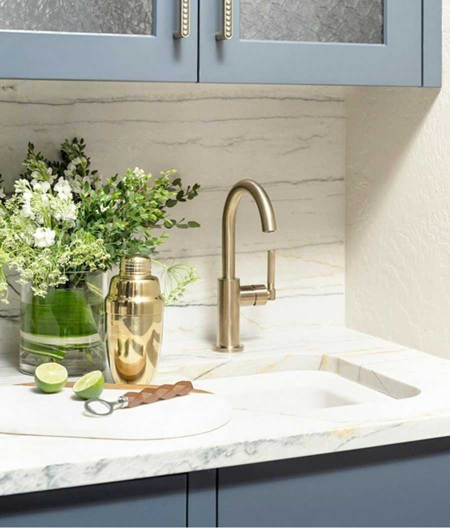 В кухне всегда стильно смотрятся оттенки благородного серого. Шкафы в графитовых тонах гармонируют с белым фартуком из мрамора и такой же столешницей. Хотите добавить акцентные нотки? Выберите черный смеситель.