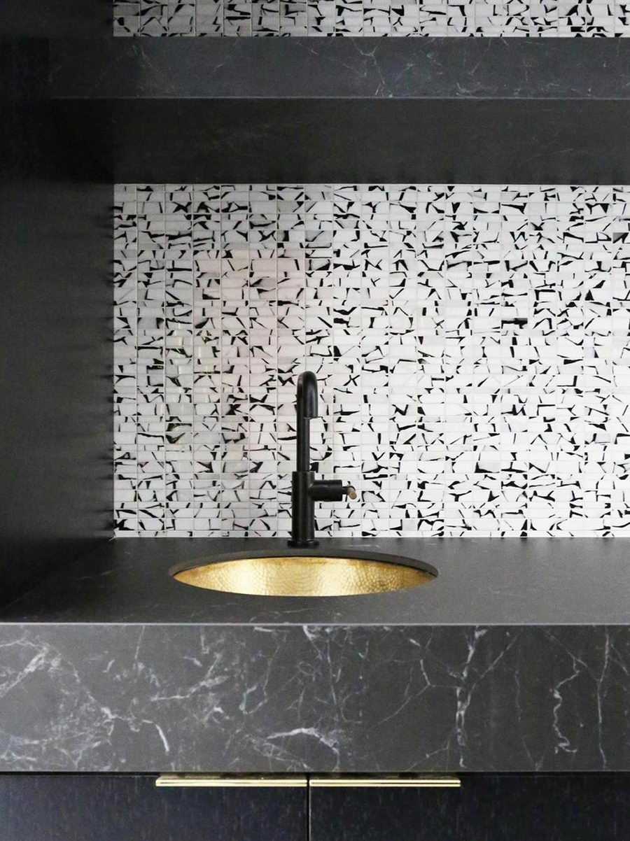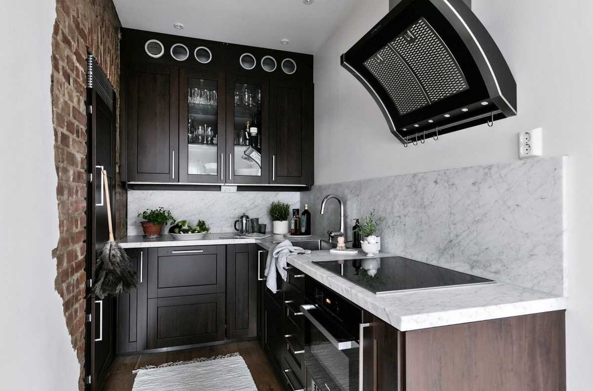 Хотите создать элегантный интерьер? Попробуйте использовать два основных тона в оформлении. Фартук черно-белый из мрамора и аналогичного оттенка столешница – вот единая концепция, на основе которой можно подбирать другие предметы интерьера.