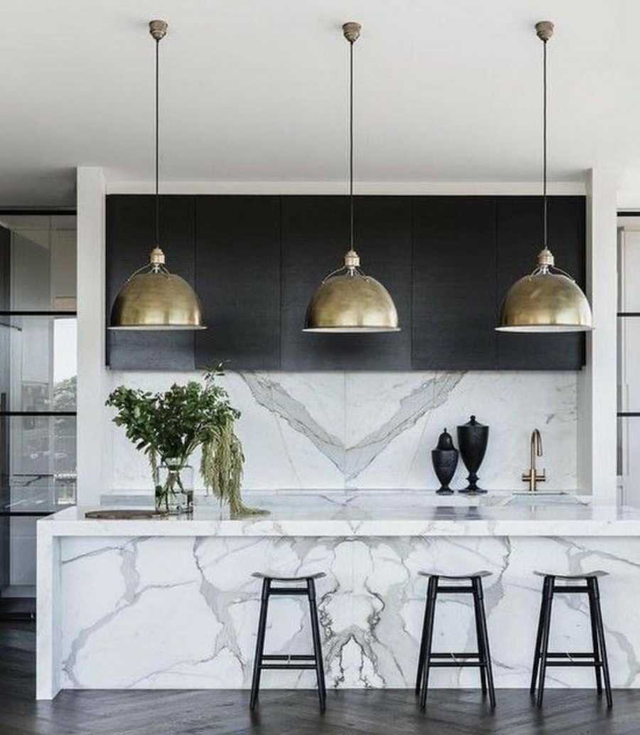 Пространство, оформленное в монохроматическом стиле, требует создания белого мраморного фартука. Отлично смотрятся с ним лампы черного цвета.