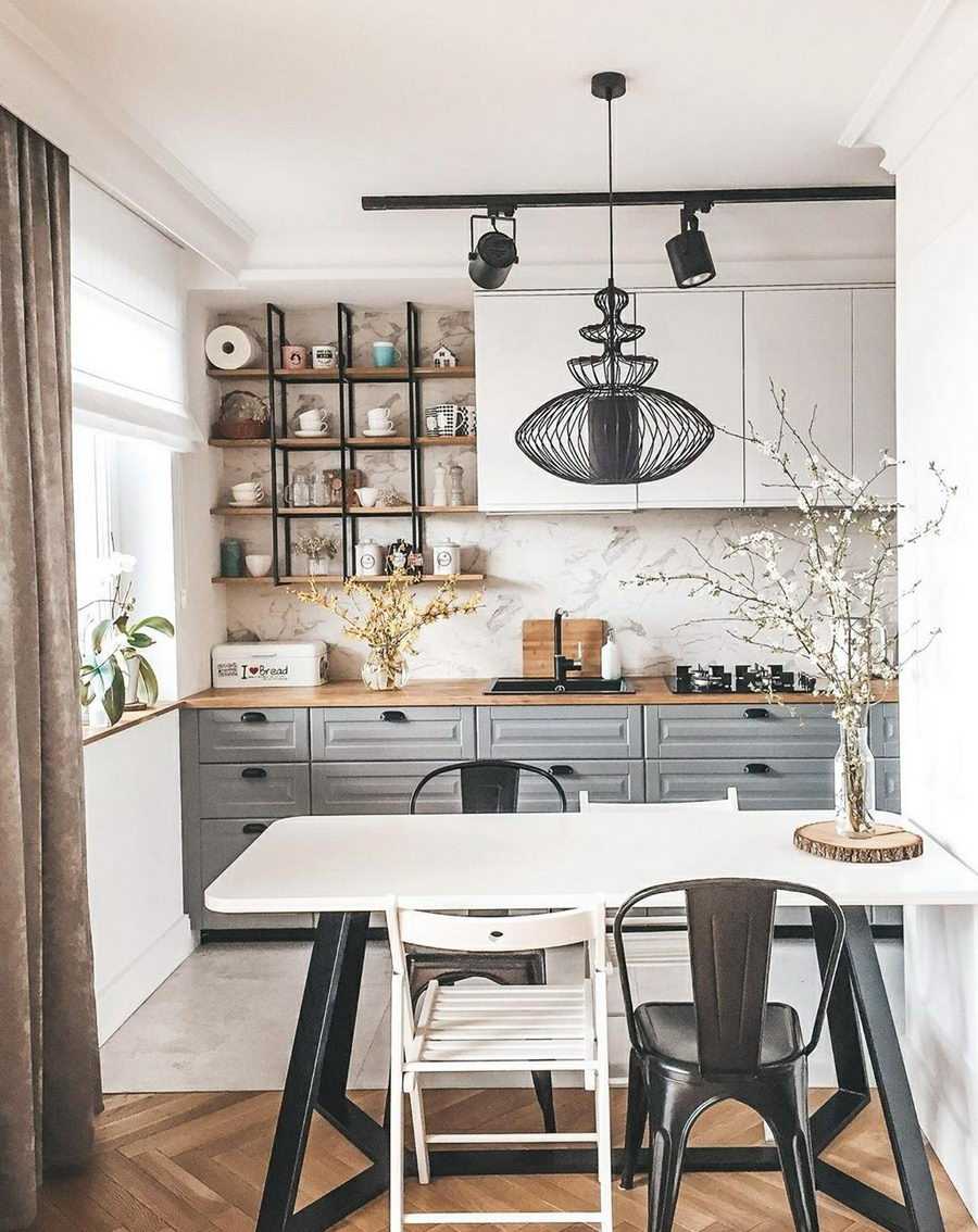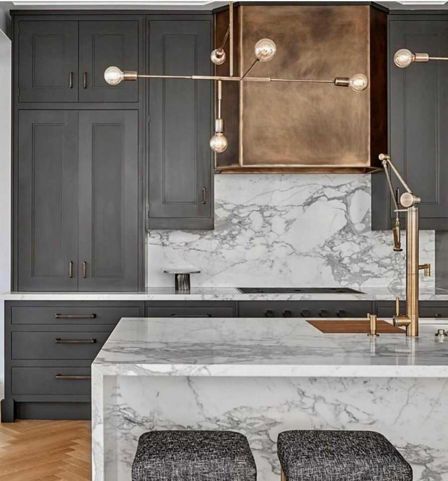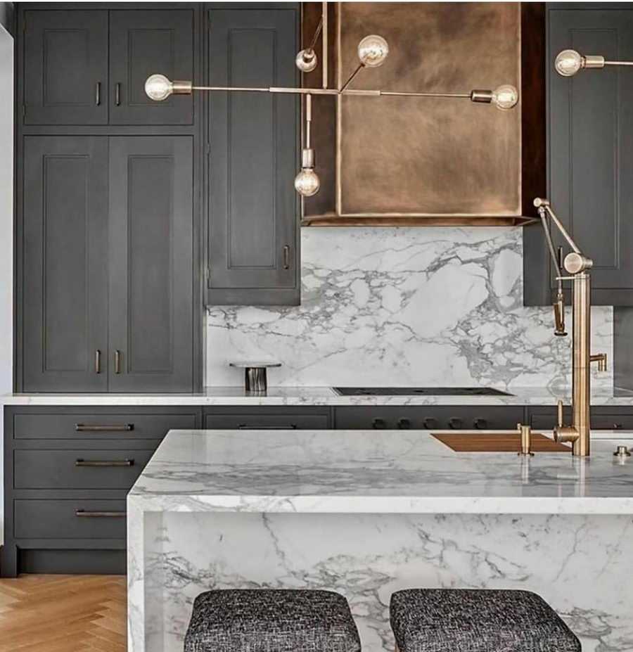 Очень модным в 2019-2020 году будет столешница и фартук серо-белого мрамора. Попробуйте воплотить это решение в жизнь, и ваша кухня будет выглядеть утонченно и аристократично!