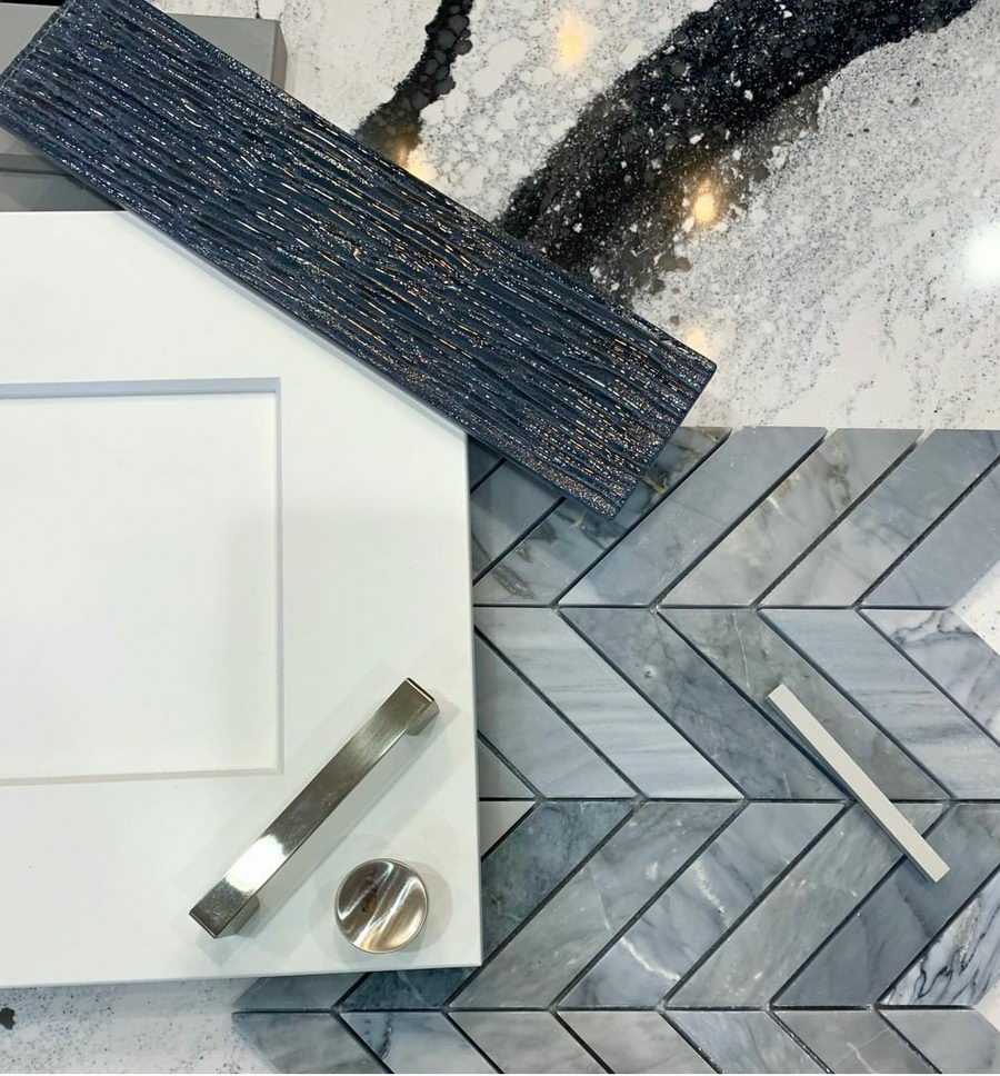 Хотите создать кухню в стиле минимализм? Оформите белый фартук из мрамора и добавьте в интерьер серые аксессуары.