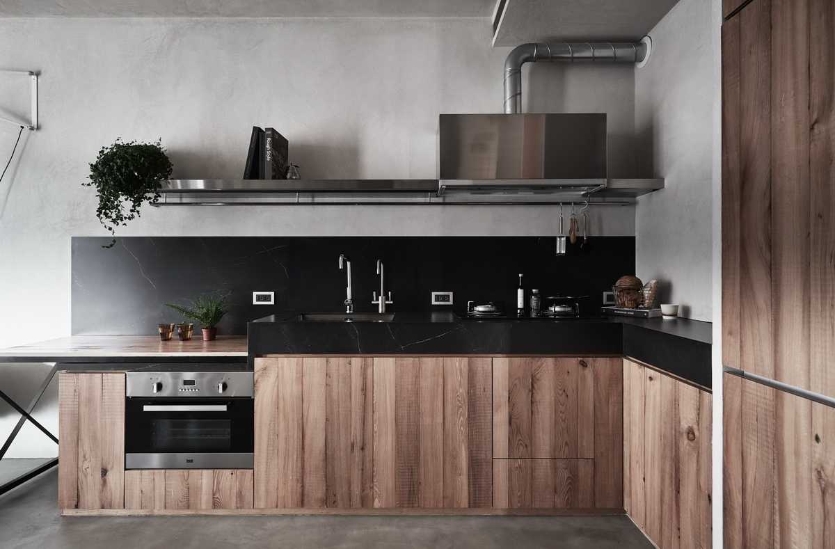 - Под дерево или камень. Такое оформление часто используется в кухнях стиля лофт и эко. Гарнитур дополнит любую кухню независимо от цветовой гаммы. Этот вариант считается традиционным, поэтому при порче одной из деталей ее легко можно заменить.