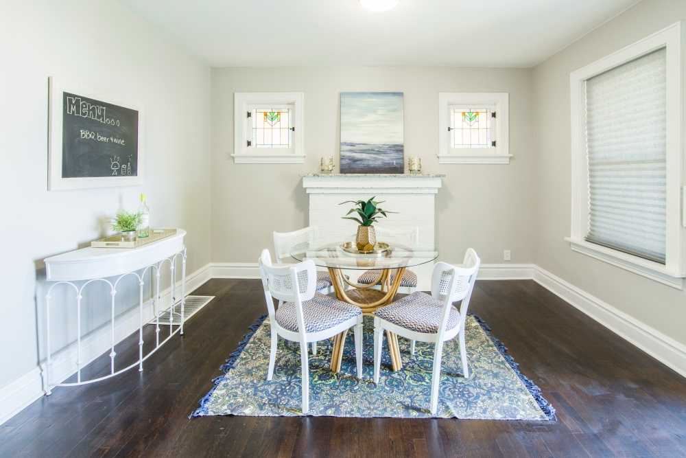 Естественно, стулья должны быть с такими же, так что придется искать набор — стеклянный стол с кованными ножками и стулья к нему. Если столешница будет прямоугольной, вдоль длинной стены можно будет поставить скамью.
