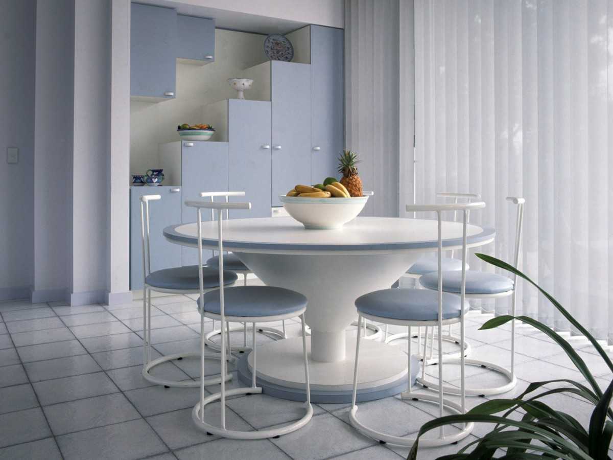 В интерьер кухни, выполненный в современном стиле, прекрасно впишется круглый стол, обладающий металлическими или деревянными простыми ножками. Количество ножек у традиционного круглого стола – от 1 до 4 штук, самый удобный вариант – применение одной массивной опоры, поскольку все члены семьи могут одновременно сесть за стол и встать из него, в результате чего трапеза будет более простой и непринужденной.