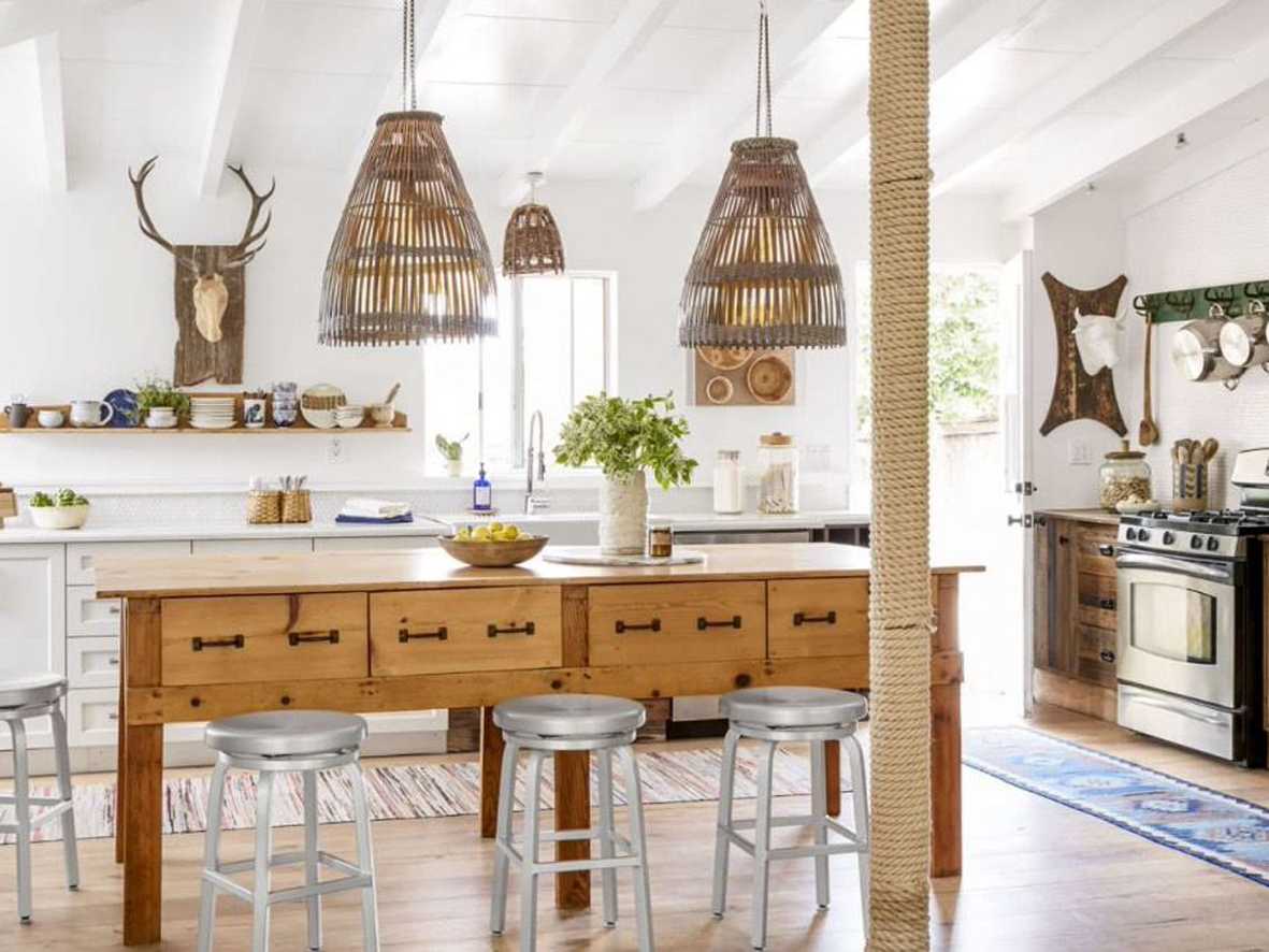 Добавить интерьеру кухни теплых нот можно с помощью текстур беленого дуба, грубой шерстяной вязки, а также темно-красных этнических узоров на льняном фоне.
