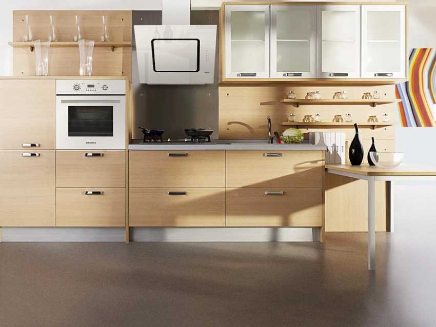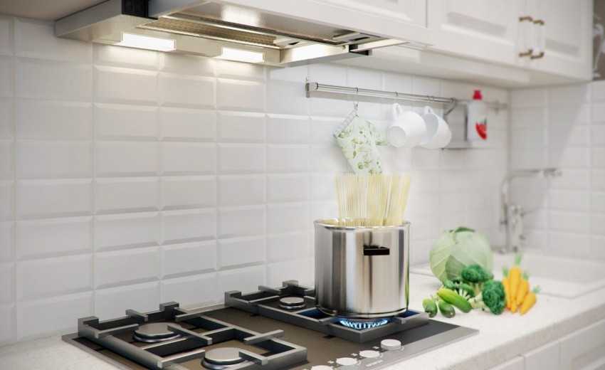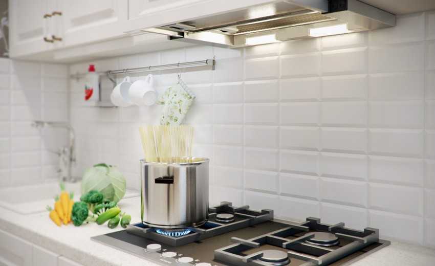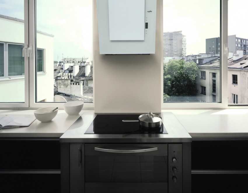 При распределении места на стене, нужно помнить о ширине подвесных шкафов, которые будут находиться по соседству с устройством. Прибор должен быть примерно одинаковой с ними ширины, при этом не устанавливаться впритык к боковым стенкам мебели. По размеру он подходит под варочную панель. В среднем ширина плиты – 50 см, вытяжки – 55 см.