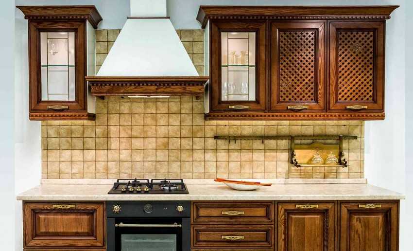 Пристенная вытяжка с эмалированным корпусом объединена цветом с мебелью в классическом стиле