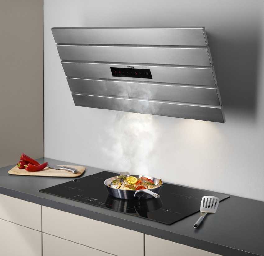 Изучая каталоги производителей, также можно заметить подвид настенной вытяжки, у которой рабочая поверхность расположена под наклоном. Сразу стоит отметить, что каких-либо особенностей у такого форм-фактора нет, но при этом есть несколько важных преимуществ:
