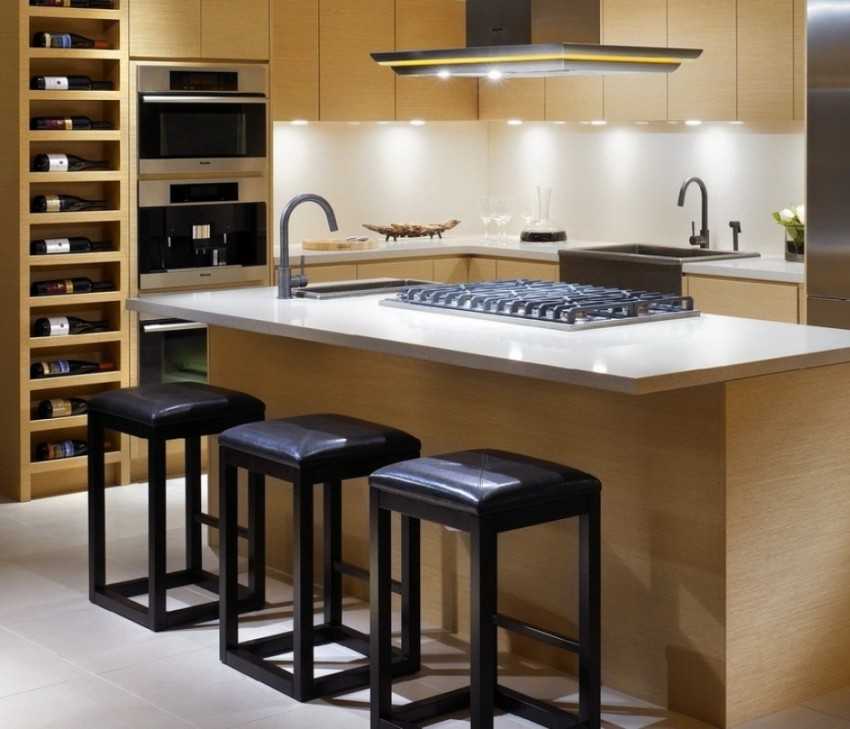 Чтобы оптимально развернуться в таком пространстве, нужно подбирать под размеры и гарнитуры, и конечно же, кухонную технику.