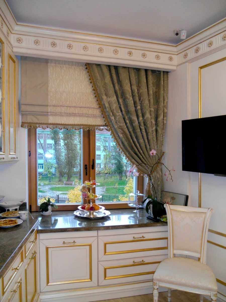 В маленькой кухне идеально смотрятся короткие шторы. Простые полупрозрачные занавески прекрасно дополнят интерьер, позволяя помещению оставаться светлым и воздушным. В качестве материала чаще используется тюль, органза, кисея. Востребованы в этом сезоне также рулонные и римские шторы.