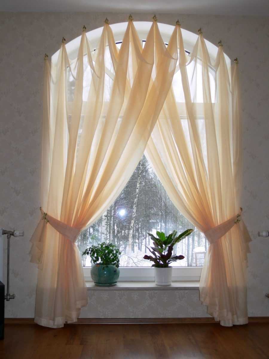 Само полотнище гардины крепится к фасаду профиля при помощи липучки: одну сторону липкой ленты пришивают к занавеске, вторую монтируют на карниз. Если подобрать нужную форму профиля карниза, то оформить лондонскими шторами можно окно любой геометрии, в том числе арочные.