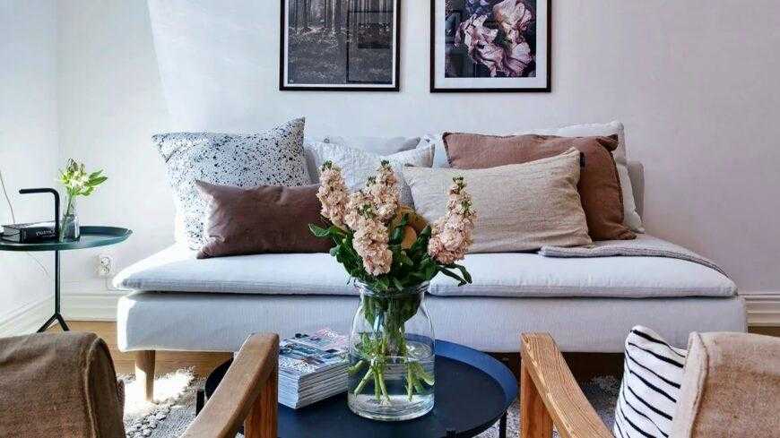 Дизайн интерьера маленькой гостиной включает использование аксессуаров