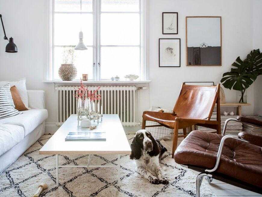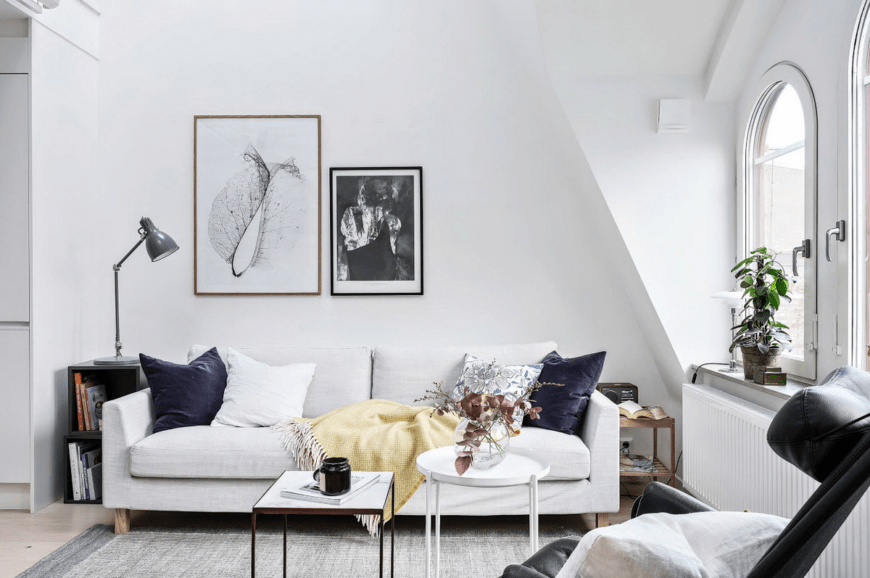 Скандинавский стиль — подходящий вариант для компактной гостиной. Основной особенностью его является способность наполнять пространство обилием света. Для отделки помещений в скандинавском стиле используют преимущественно светлые материалы, расставляя акценты с помощью ярких предметов — подушек, настольных часов, оригинальных статуэток. Оконные проемы непременно открыты, только жалюзи либо римские шторы помогут сохранить закрытость гостиной.