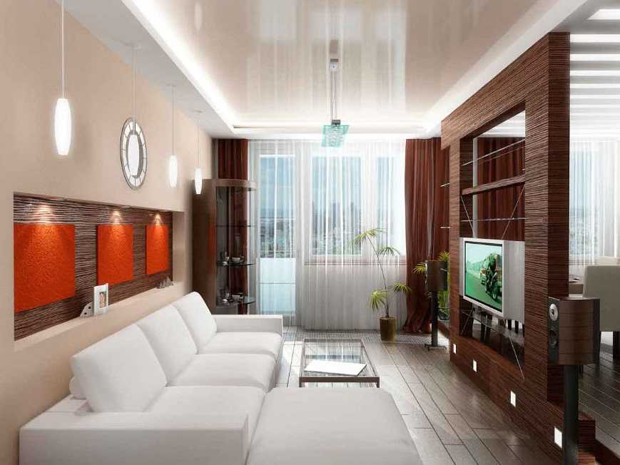 Лучший метод скорректировать недостатки длинной гостиной – продолговатые стены сделать светлыми, а узкие – насыщенным глубоким тоном. Например, можно использовать сочетание белого и черного цвета, которое станет классическим решением для такого помещения. Бежевый цвет внесет в интерьер легкость, воздушность и тепло, создав уютную атмосферу. А вот партнером ему станут кофейные тона, способствующие умиротворенному, расслабляющему интерьеру.