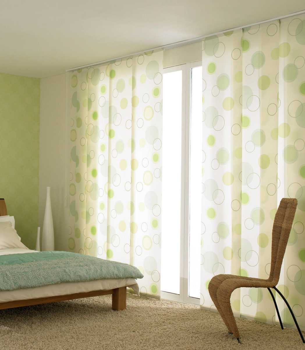 Более строго смотрится обратная комбинация — обычные гардины из органзы с небольшим количеством складок и абсолютно ровные японские портьеры нежно-салатового цвета. Тот же оттенок есть в текстиле, чуть более светлый — на потолке.