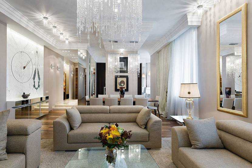 На фото современной гостиной видно, что эта комната должна быть достаточно светлой, поэтому необходимо разместить здесь достаточное количество осветительных приборов.