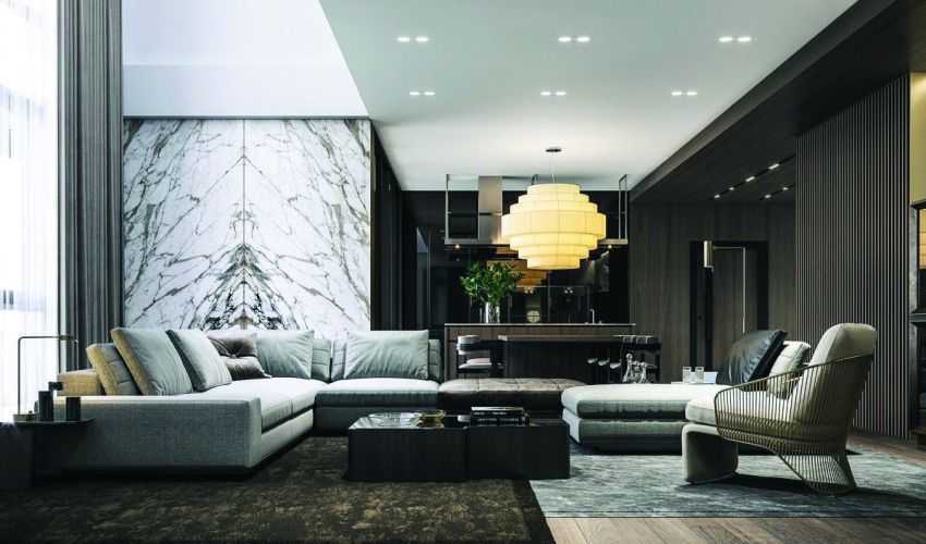 В огромной пепельной гостиной гармонично смотрятся черные и графитовые элементы (мебель, светильники). Разбавить строгую лаконичность помогут теплые оттенки (желтый, песочный) и нежная гамма зеленого (оливковый, фисташковый). Серый не должен доминировать, иначе комната выглядит безликой.