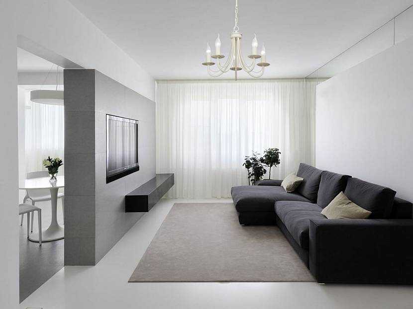 Минимализм в интерьере виден не только по количеству расставленной техники, но и по их форме или цветам. Современные гостиные часто представляют собой монохромные комнаты, в которых в одном цвете появляются различные текстуры, материалы, оттенки. Белый окрас может появиться на стенах, шторах или в качестве обивки дивана. В зависимости от материала он будет иметь немного другой оттенок, поэтому белый интерьер не будет скучным и стерильным.
