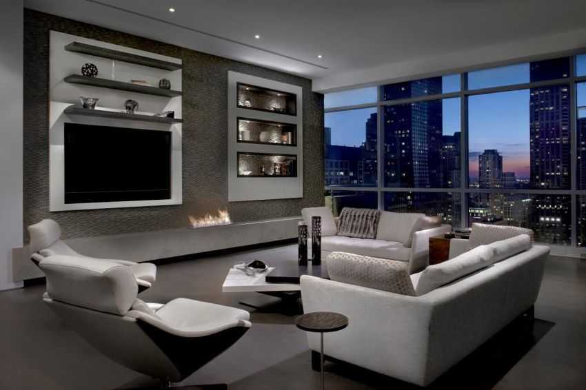 Каждой зоне современной гостиной нужна своя отдельная подсветка. Такое распределение – одновременно и функциональный и декоративный прием. И не экономь на регуляторах, чтобы менять интенсивность и яркость по ситуации.