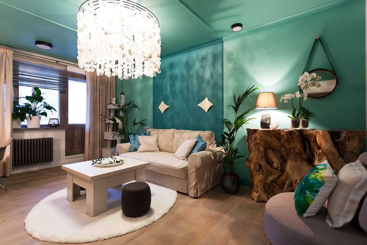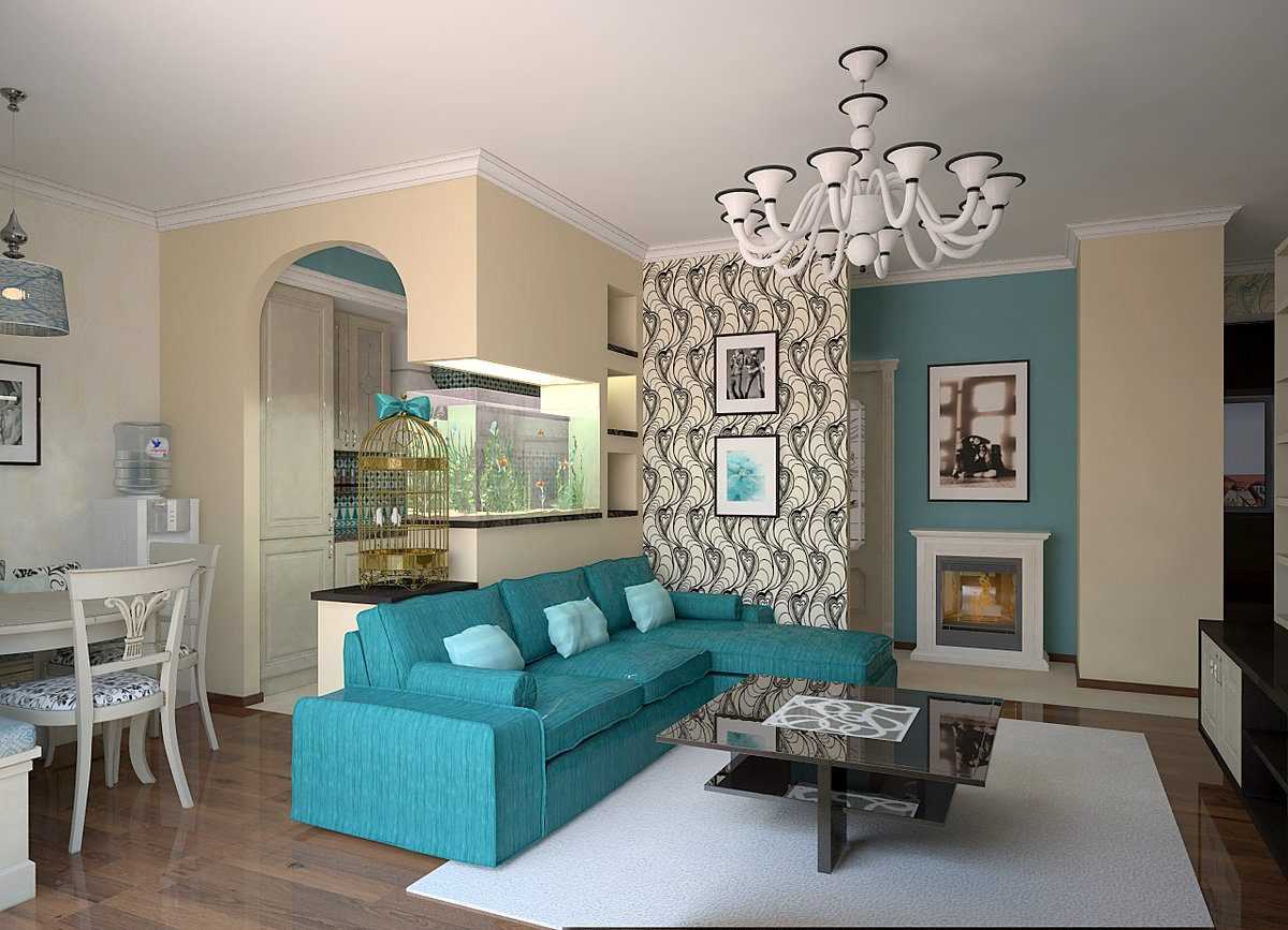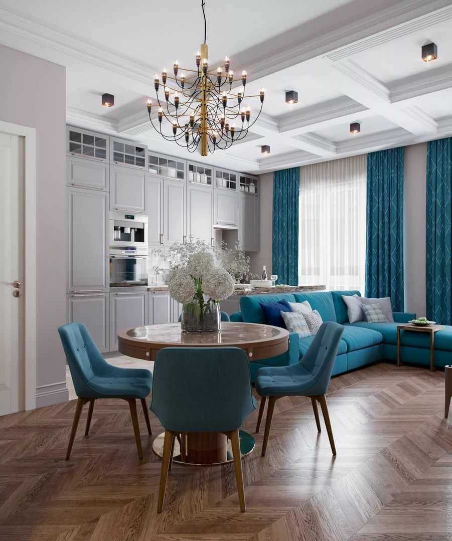 При оформлении гостиной в бирюзовых тонах, вы также должны тщательно продумать цвет дополнений. К счастью, все оттенки бирюзы очень открыты даже для удивительных деталей и смелых сочетаний. Желтые расцветки отлично смотрятся в ее компании. Известь, канареечный, солнечные оттенки — выбор за вами. Бирюзовые шторы впишутся великолепно, украшая комнату. Диван с горчичной обивкой станет основой в стиле ретро, а мерцающая золотая лампа дополнит очарование интерьера. Бирюзовый в гостиной также быстро вступит в диалог с бежевым или белым, чтобы разработать, например, скандинавскую тему. А вот стол и стулья из темного дерева прекрасно подойдут даже в современном интерьере. Бирюза дает десятки возможностей, становясь отличным холстом для экспериментов.