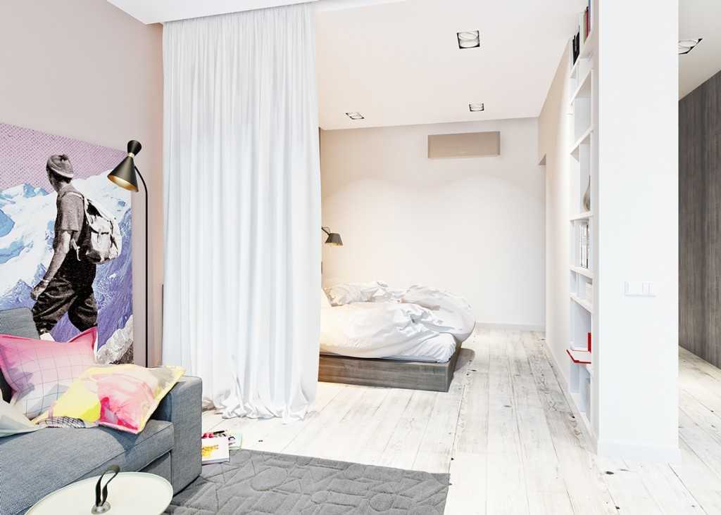 шторами, которые кроме распределения функциональных зон создадут в интерьере яркий акцент и необычный дизайн;