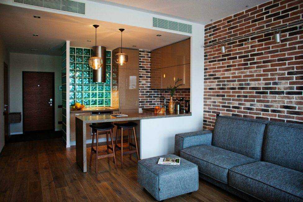 Отсутствие перегородок. В таких квартирах кухня от главной комнаты зачастую отделяется барной стойкой или обеденным столиком. Открытость позволит визуально расширить пространство и сделать комнату светлее. Красиво смотрятся стойки, плавно переходящие в кирпичную кладку стены. Благодаря такому дизайнерскому ходу создается единый стиль. А уместным дополнением к небольшому столику из стекла или металла станут деревянные стульчики, складные табуреты или барные стулья.