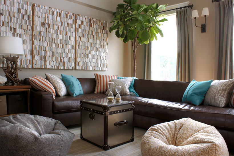 Акцентом в интерьере гостиной с мебелью темного цвета, может быть яркий или кипенно-белый декор, при условии, что такой акцент — единственный на всё помещение. Иногда бывает достаточно покрыть диван белым чехлом, и гостиная заиграет новыми красками.