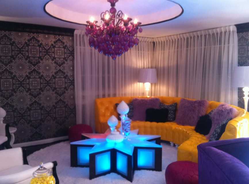 Как бы это удивительно не звучало, но одновременно яркие фиолетовый и жёлтый просто чудесно дополняют друг друга в интерьере помещений. В результате их различных способов комбинирования создаётся интересный, оригинальный и очень красивый дизайн. Главное не забыть разбавить столь эффектную компанию более лаконичным бежевым или белым, а также стараться избегать чётко выраженных переходов между основными тонами.
