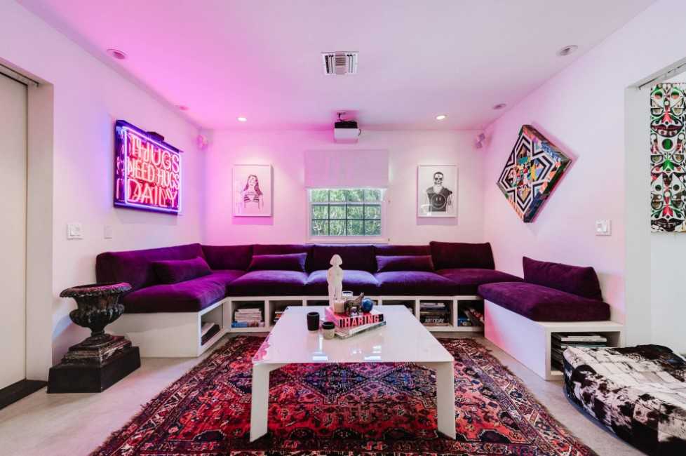 Темно-фиолетовый диван можно использовать в качестве фона композиции. Если вы хотите получить «кукольный» и яркий интерьер, начните «играть» с контрастом. Игра с розовыми и желтыми предметами, а также сиреневый контраст помогут вам добиться желаемого.