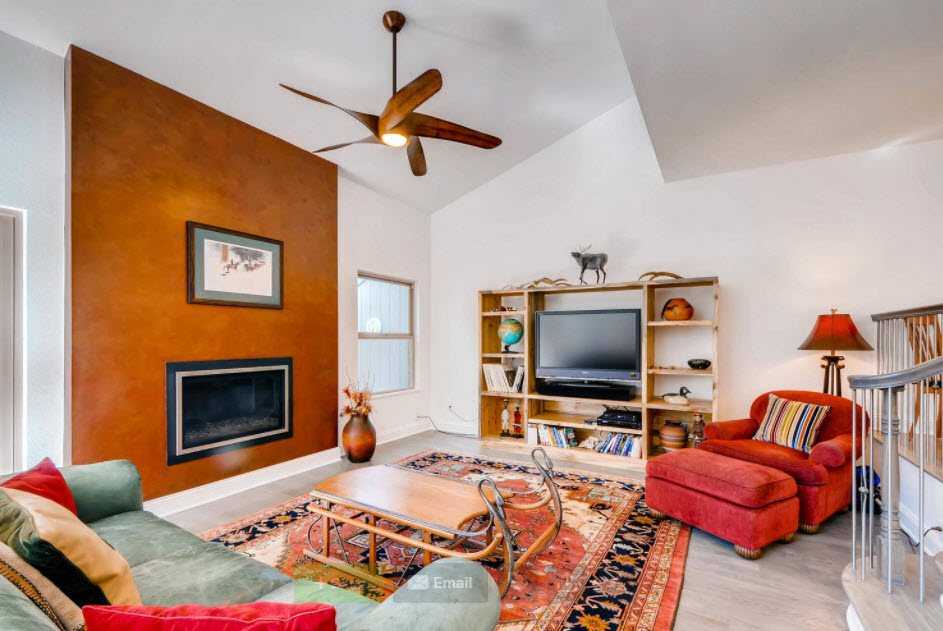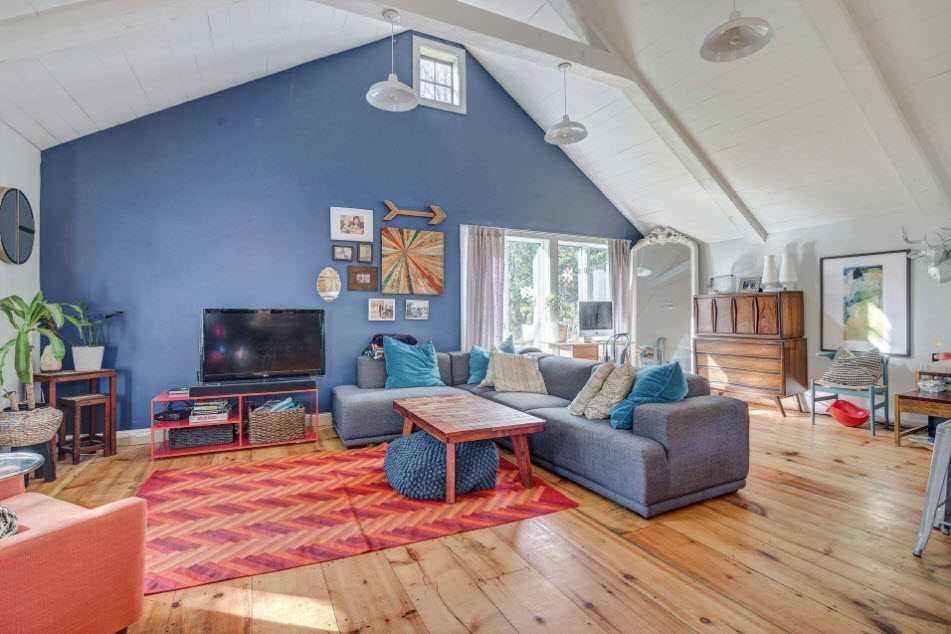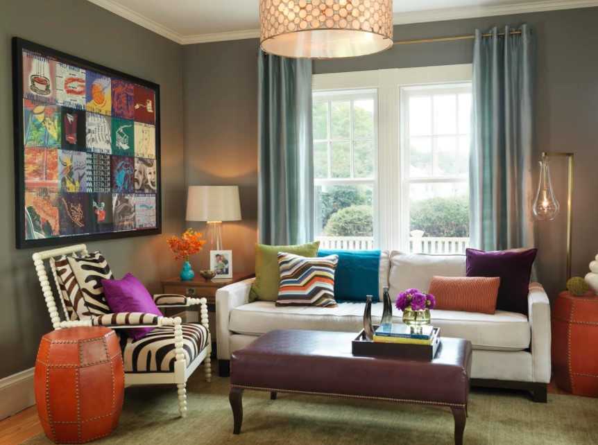 | Яркая гостиная | В ярком дизайне с использованием насыщенных цветов отлично будет смотреться темно-серый диван из замшевой обивки или эко-кожи. | 1. Лучше подбирать желтые или синие контрастные цвета.