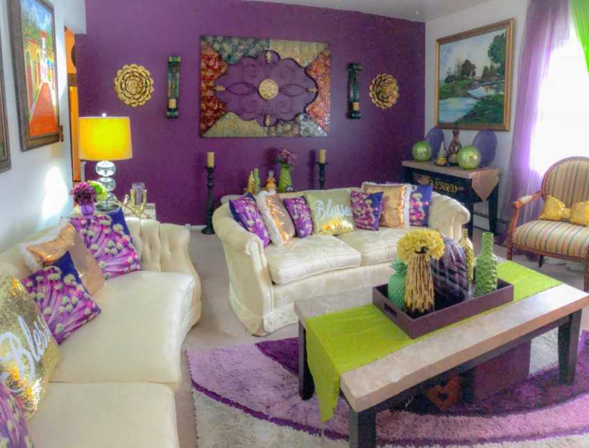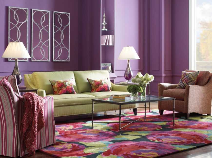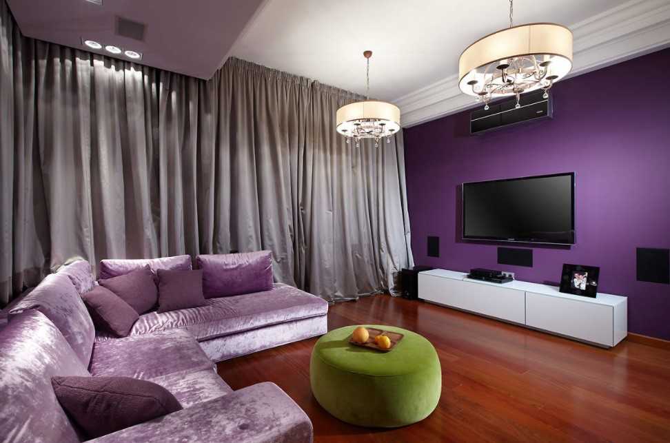 Фиолетовый цвет отлично подходит для роскошной обстановки гостиной. Дело в том, что спектр фиолетового имеет два вида теплые и холодные оттенки, потому что в одних из них больше добавлено синевы, а другие имеют много красных полутонов.