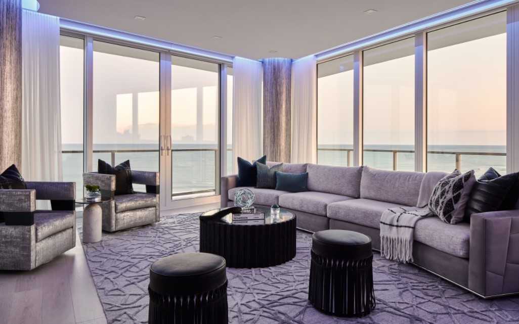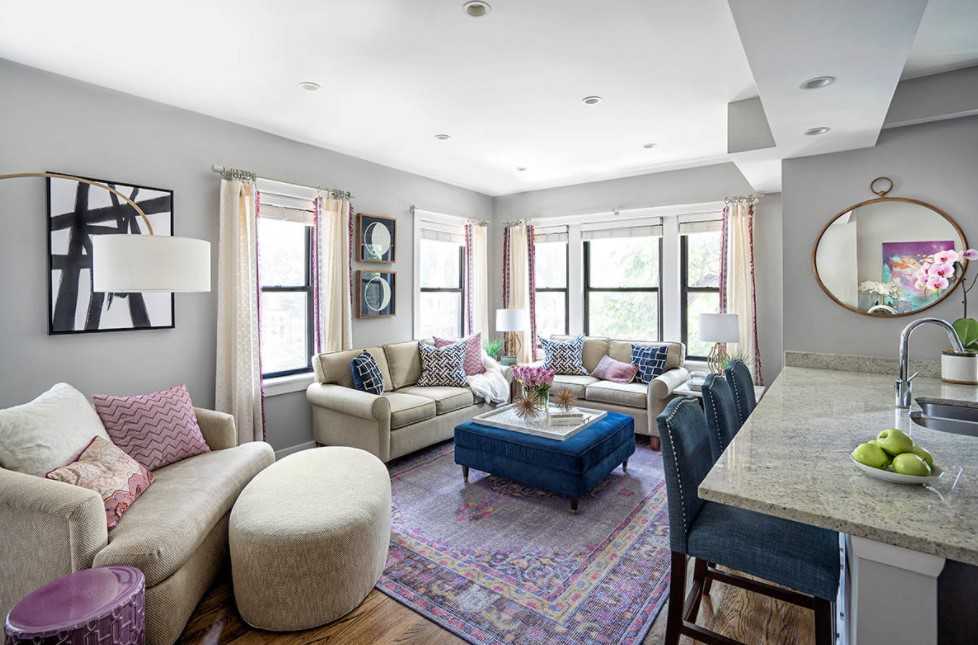 Ценителям классического, элегантного дизайна интерьера, напоминающего стиль квартиры в Нью-Йорке, можно выбрать элегантное сочетание сиреневого с белым. Прекрасный интерьер на основе грязно-белого с серебром и сиреневого вызовет восторг у гостей шиком и роскошной эстетикой. Симметричное расположение диванов поощряет беседы с семьей, друзьями, делает пространство чрезвычайно упорядоченным, гармоничным.