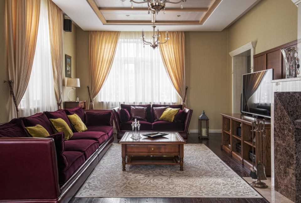 Допустимо в сочетании с фиолетовым диваном использовать желтые тона в качестве акцентов: светло-желтые подушки, горчичного или медового оттенка шторы на окнах, различные декоративные элементы охристых тонов – все это придаст вашей гостиной динамики и торжественности.