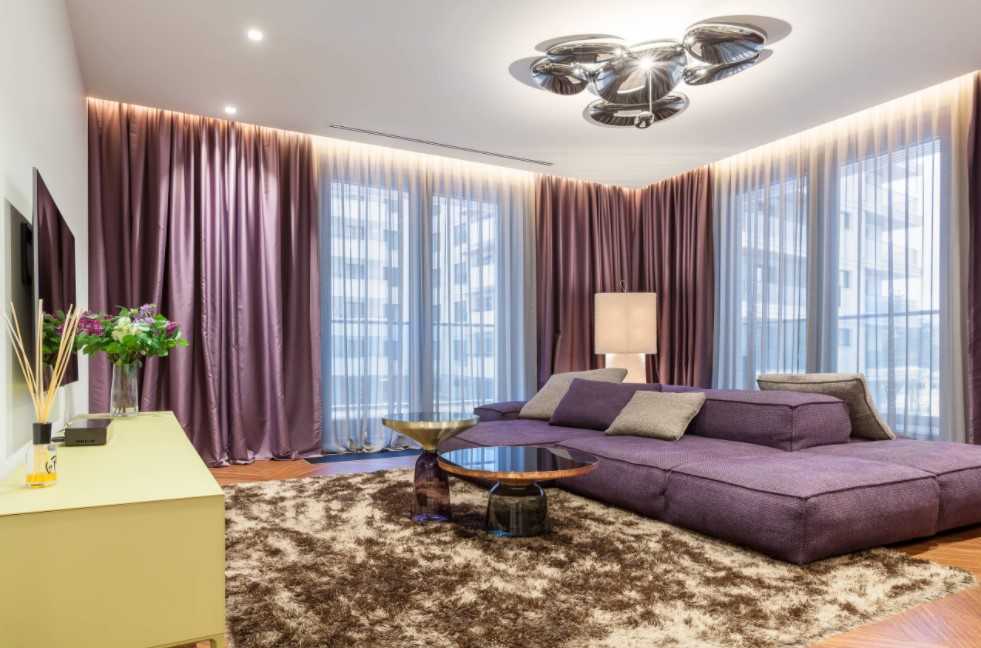 А пока обратите внимание на готовые интерьерные решения, предложенные в фото подборке, которые станут наглядным примером того, как можно красиво обыграть фиолетовый в дизайне гостиной