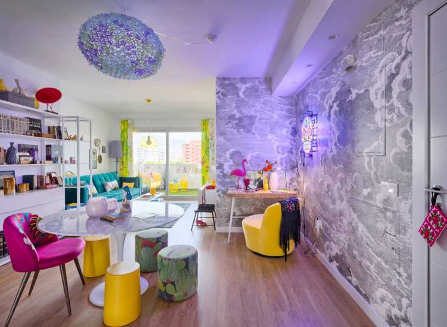 Обычно ярко оформляют одну акцентную стену или какой-то определенный участок, чтобы подчеркнуть его функциональность.