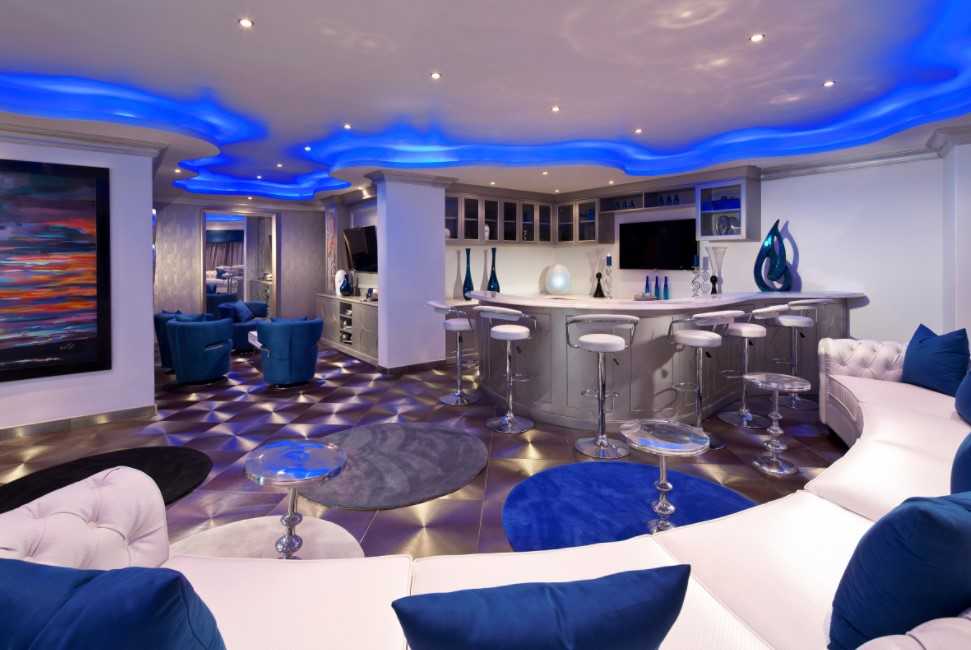 Такой минимализм позволяет более детально рассмотреть дизайнерские предметы, которых здесь немало: небольшие подвесные люстры, каскадом подвешенные над барной стойкой, ароматическая лампа в африканском стиле, картина с изображением улицы небольшого города. Все здесь дышит спокойствием и уверенностью.
