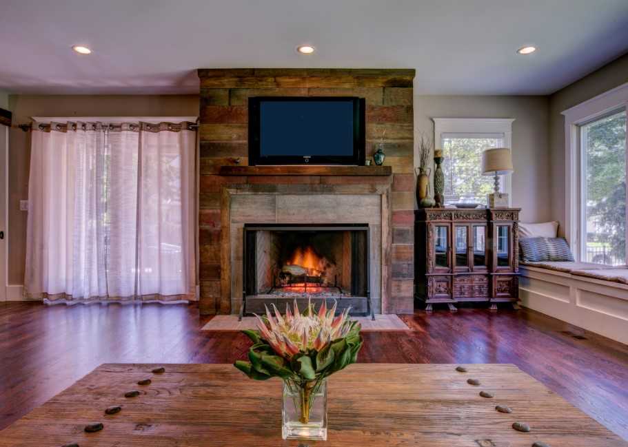 На фото бархатный фиолетовый диван с кантом из золотистого шнура составляет гармоничную композицию с камином и деревянным столиком в интерьере загородного дома.